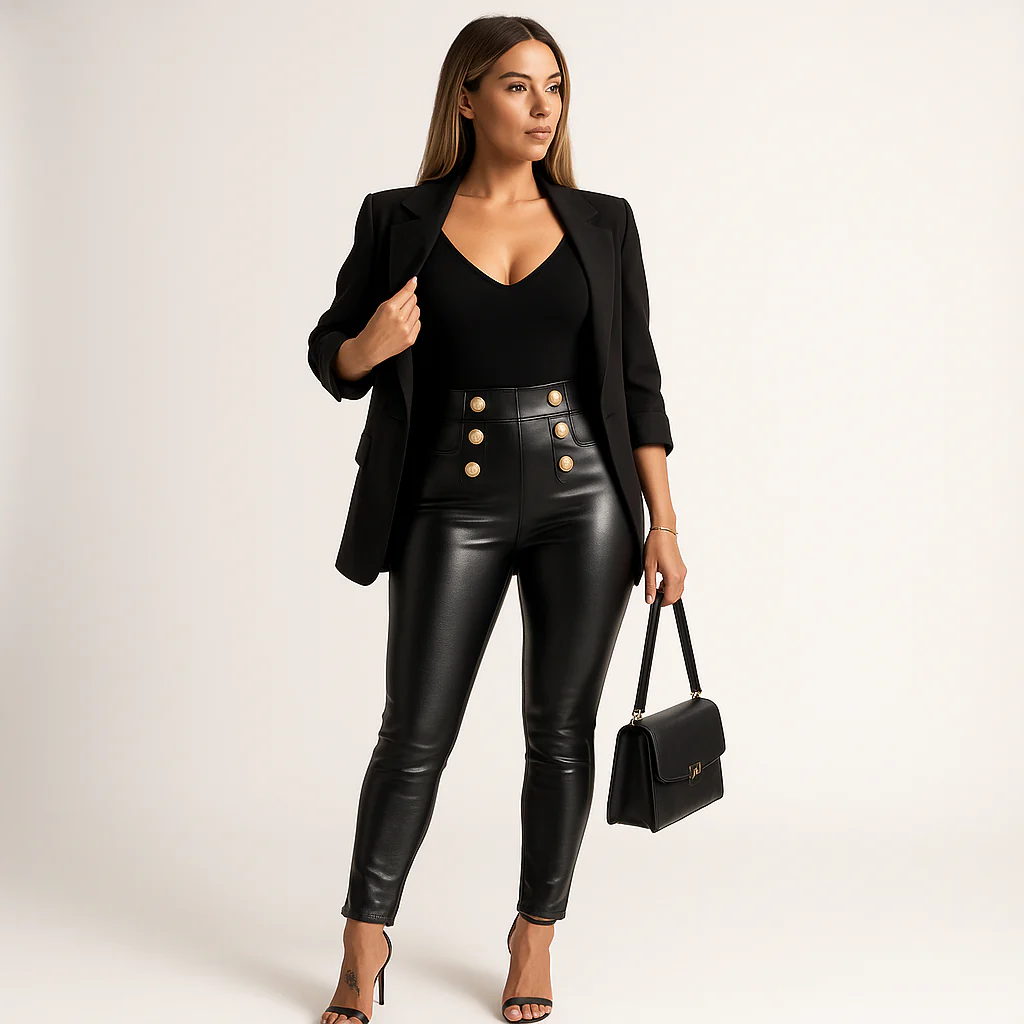 Ce pantalon en imitation cuir taille haute avec boutons dorés est une pièce forte qui allie sophistication et modernité.