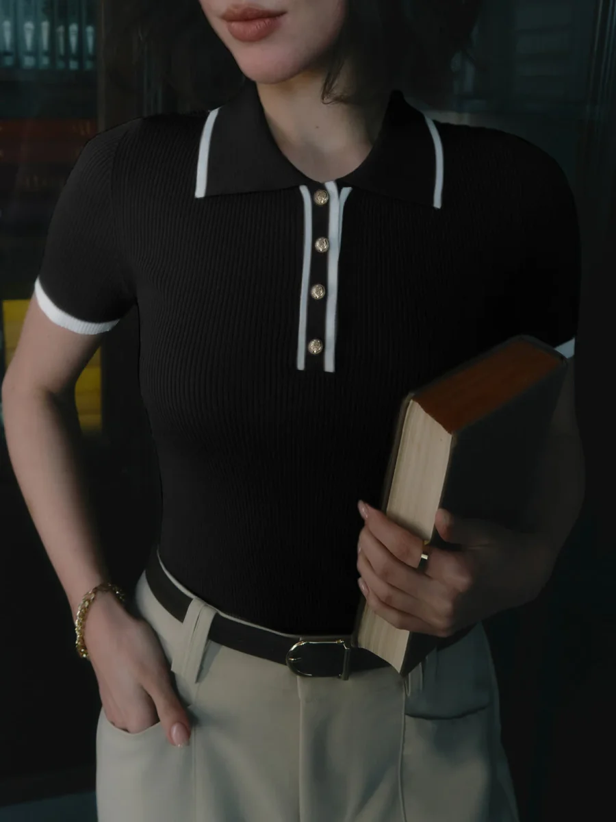 Ce polo en maille côtelée avec boutons dorés incarne l’élégance discrète et le raffinement casual.