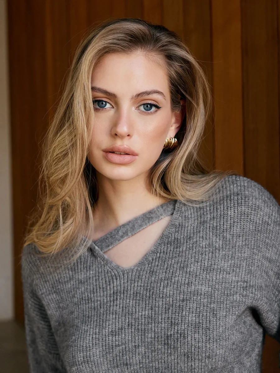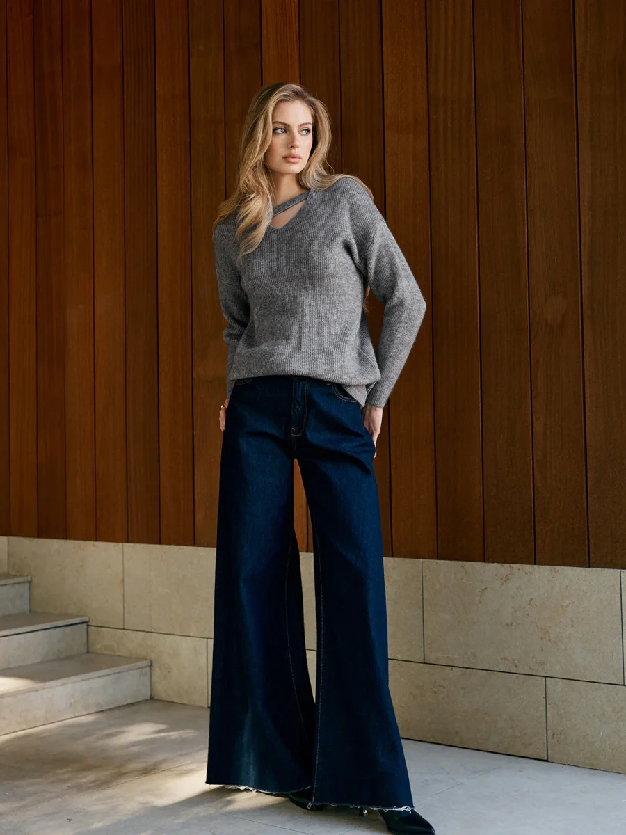 Ce pull gris chiné allie douceur et modernité avec son encolure en V agrémentée d’un détail croisé tendance.