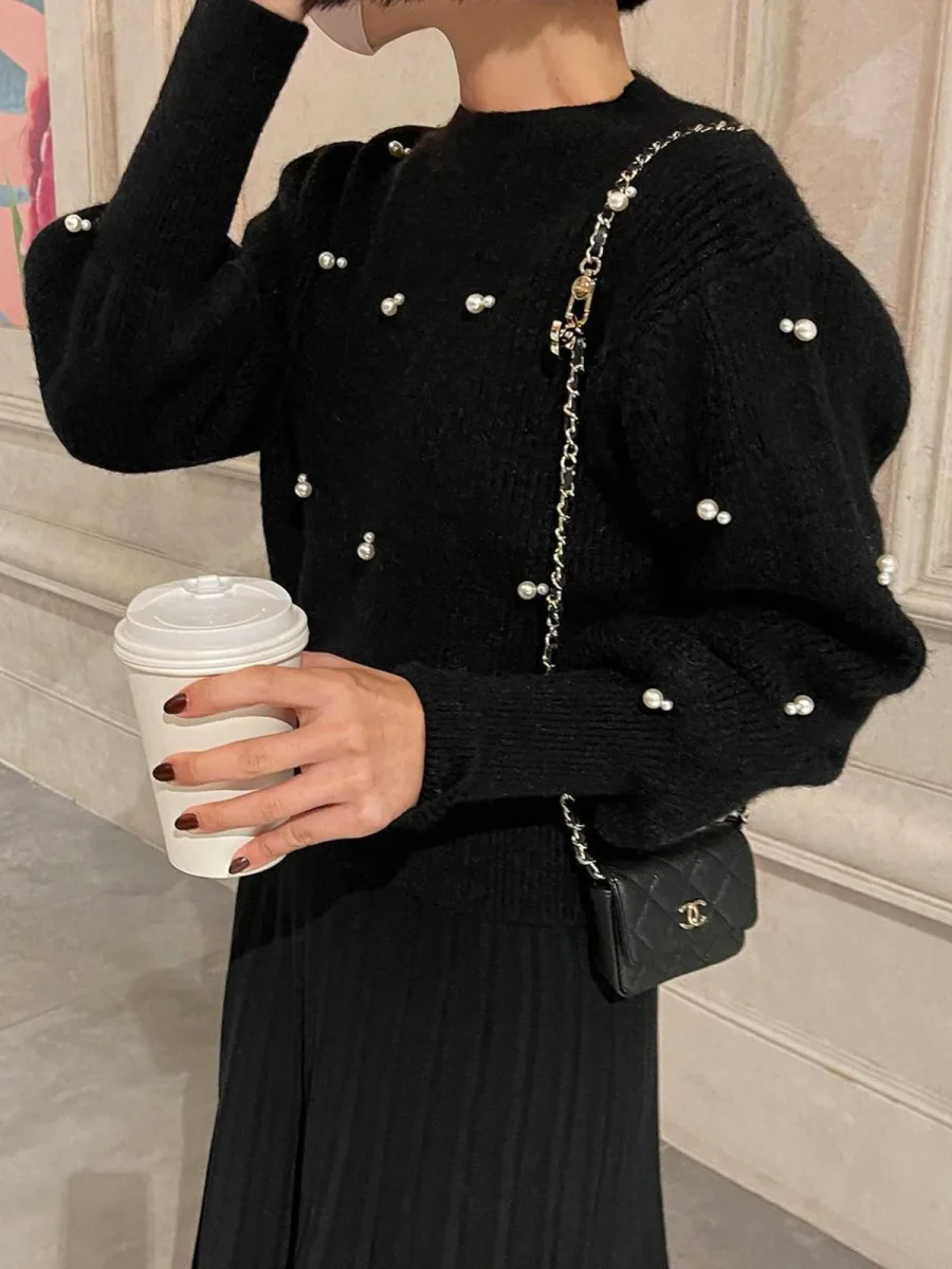 Ce pull noir orné de perles combine sophistication et confort dans une coupe douce et légèrement ample.