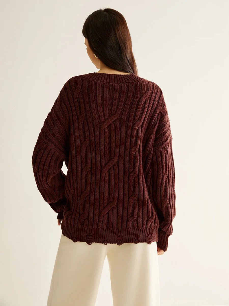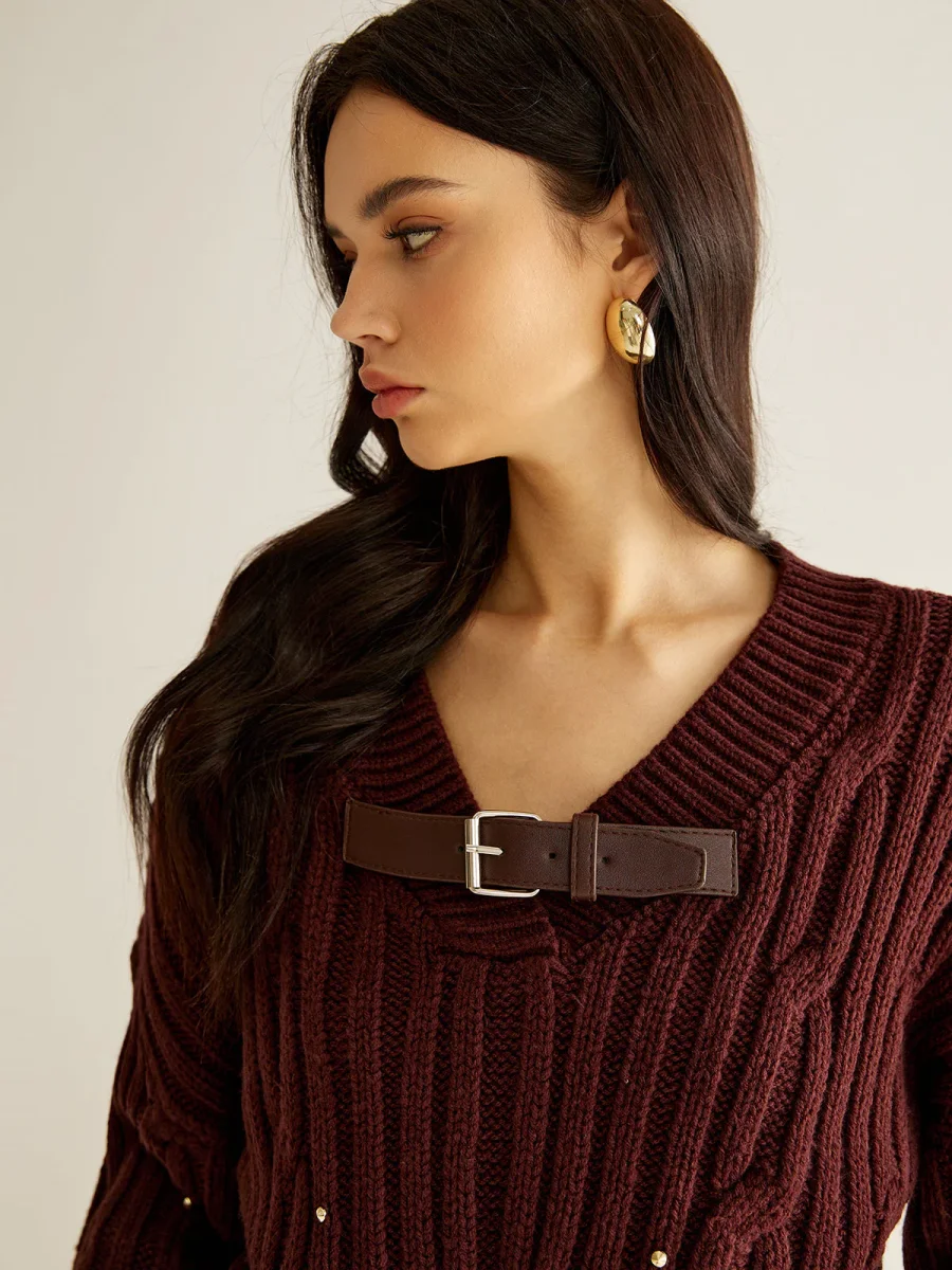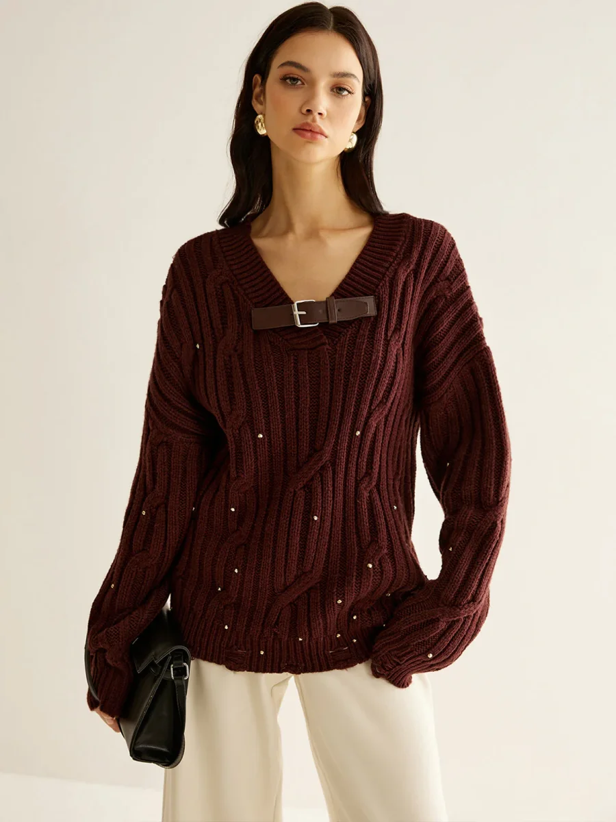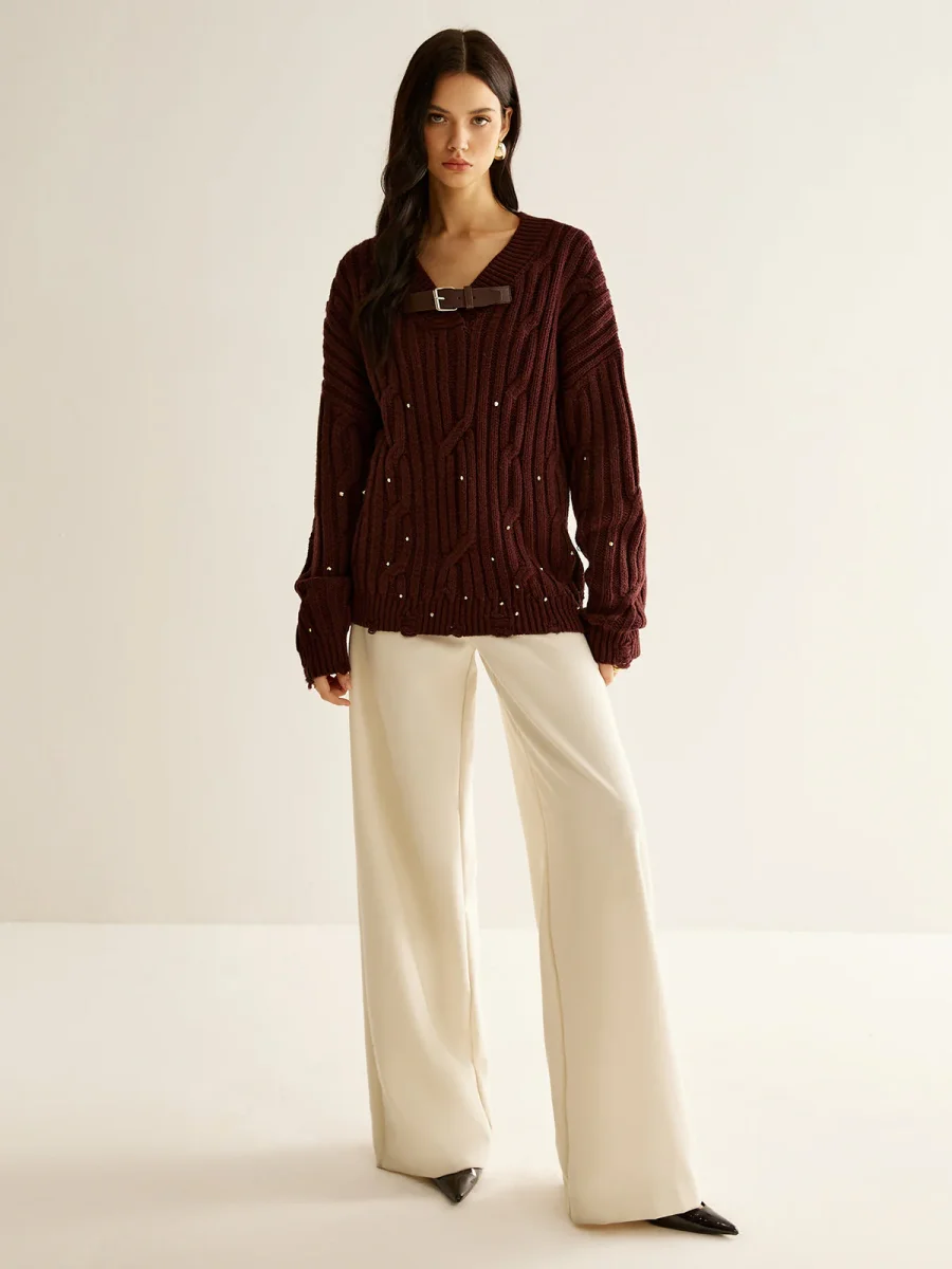 Ce pull oversize en maille côtelée bordeaux se distingue par son col en V orné d’une boucle effet cuir et parsemé de perles discrètes.