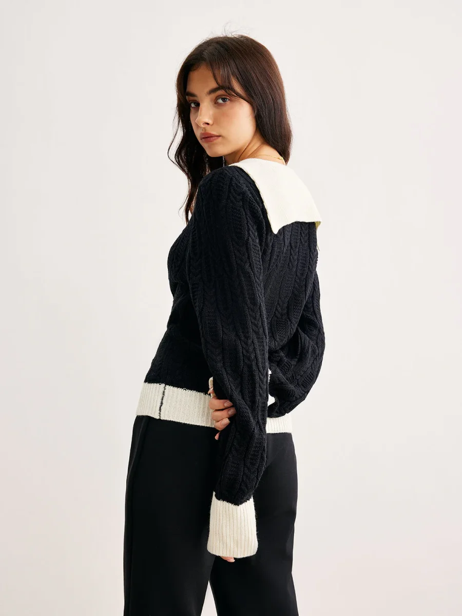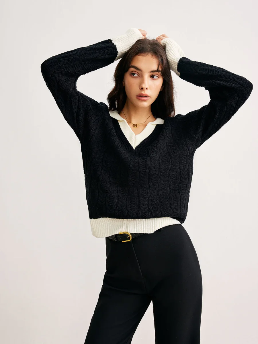 Ce pull en maille torsadée revisite le style collège avec ses bords contrastés et son col en V structuré.