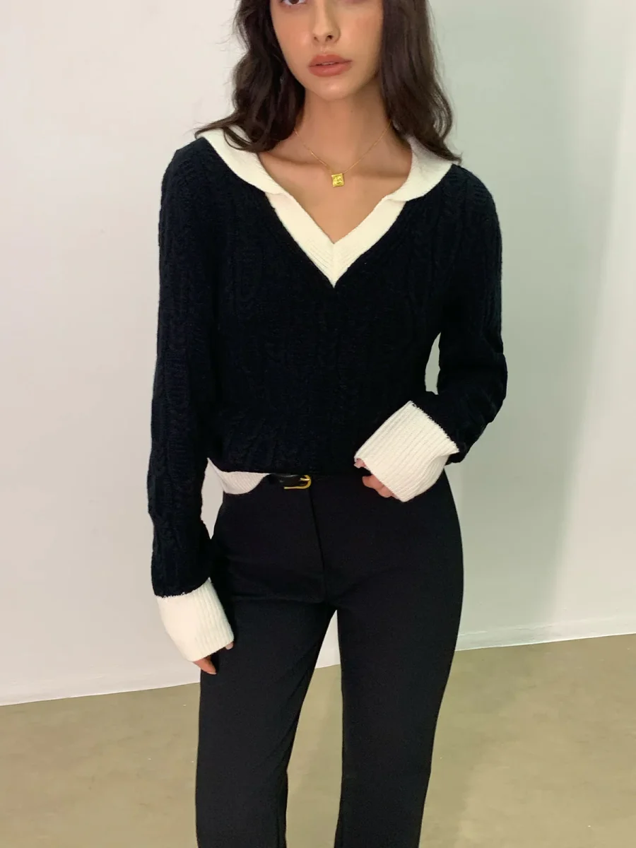 • Style preppy : Col en V, poignets et ourlet contrastés en blanc