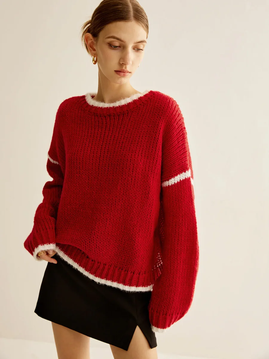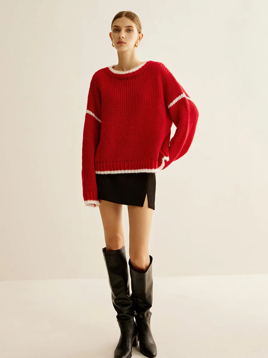 This red sweater with contrasting trim adds a vibrant, original touch to your winter outfits.