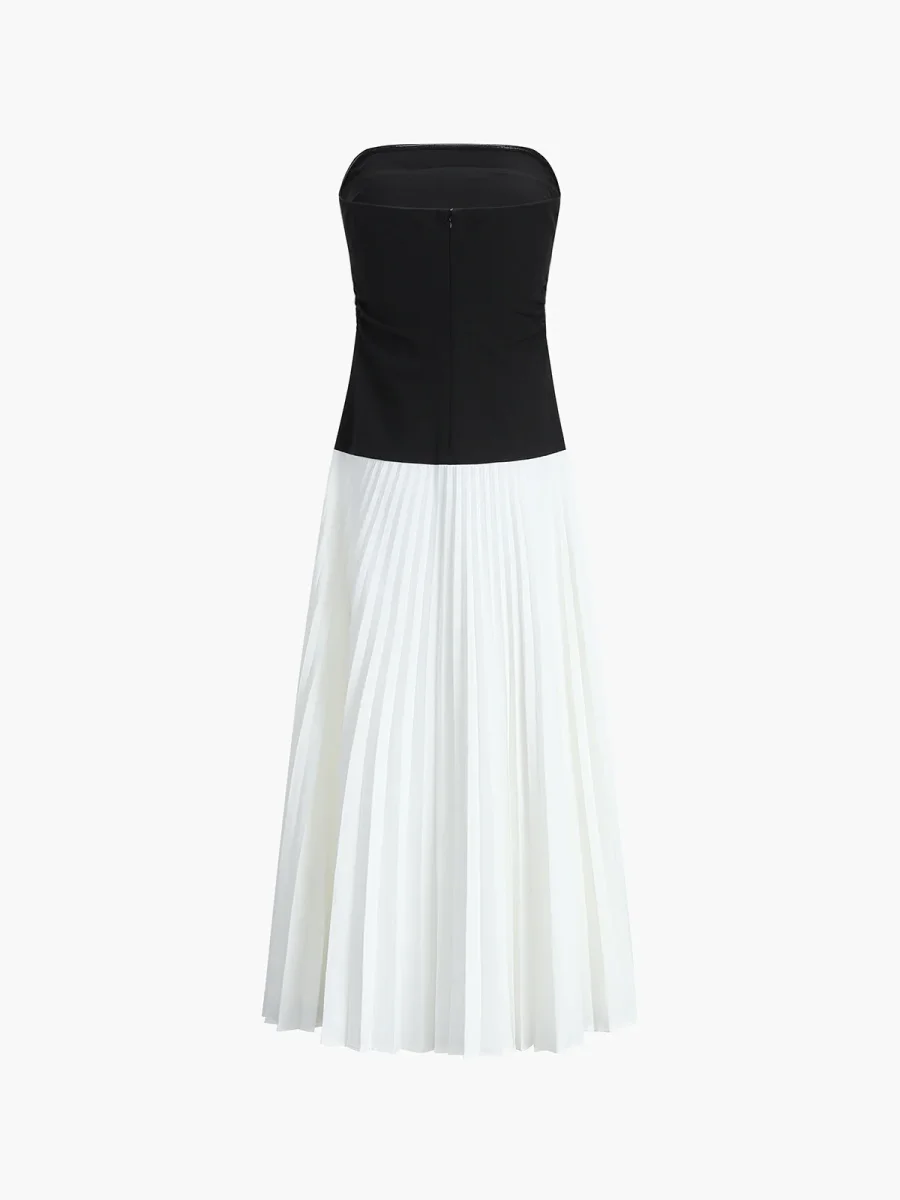 Cette robe bicolore bustier allie modernité et féminité grâce à son haut noir structuré et sa jupe plissée fluide.