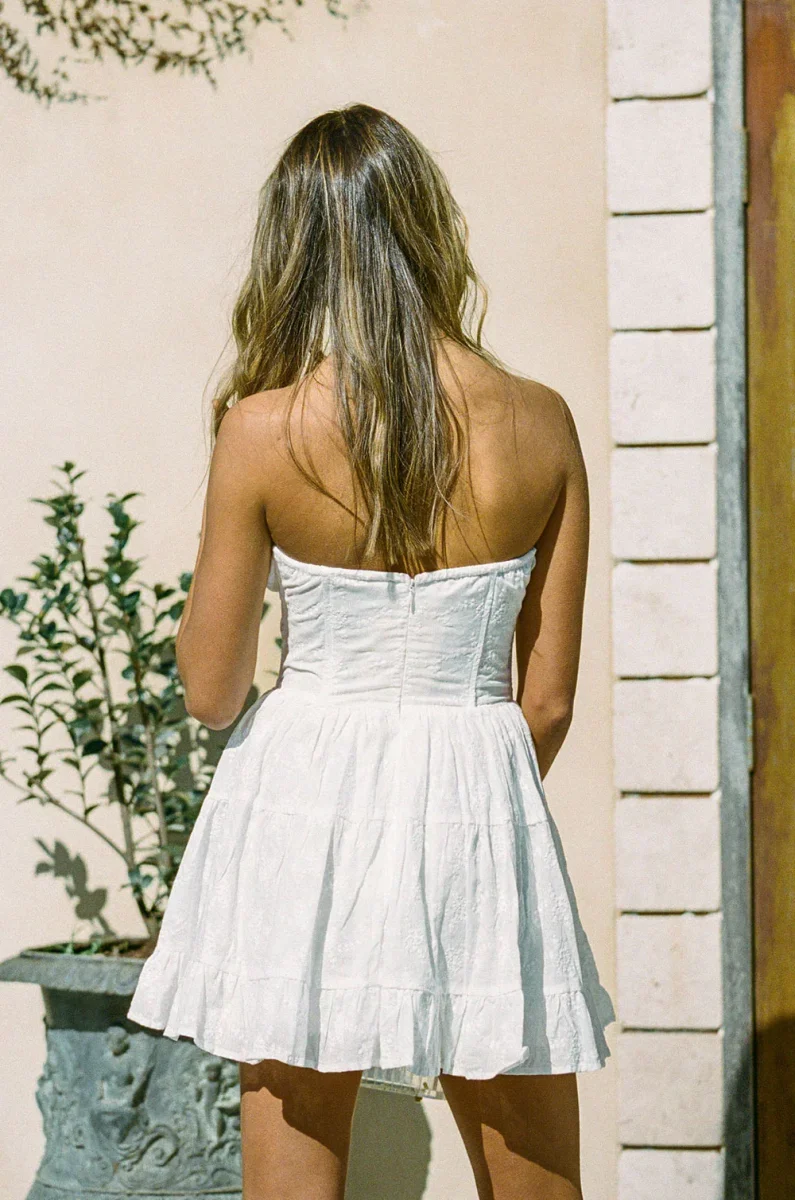 Cette robe courte blanche au style bustier est l’incarnation parfaite de la fraîcheur estivale.
