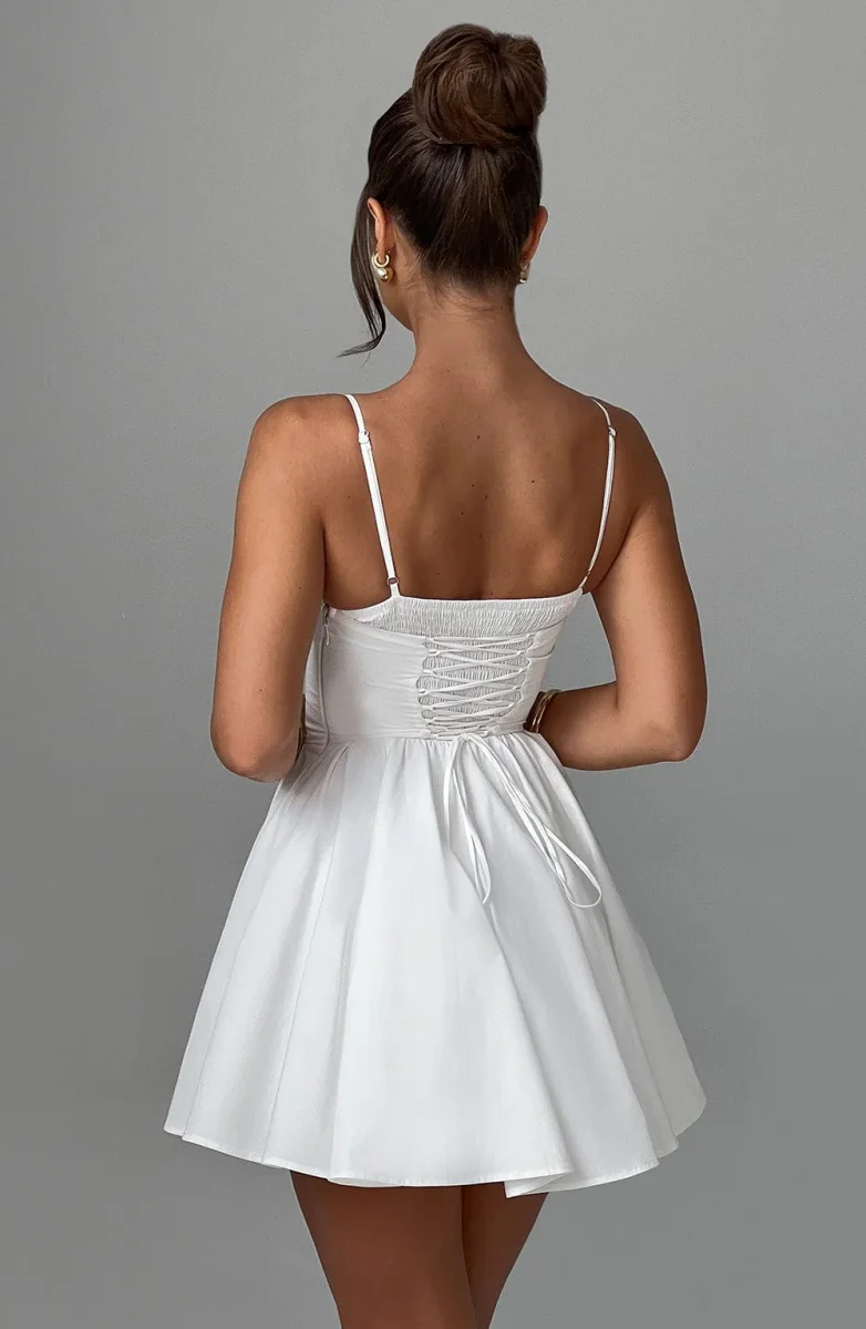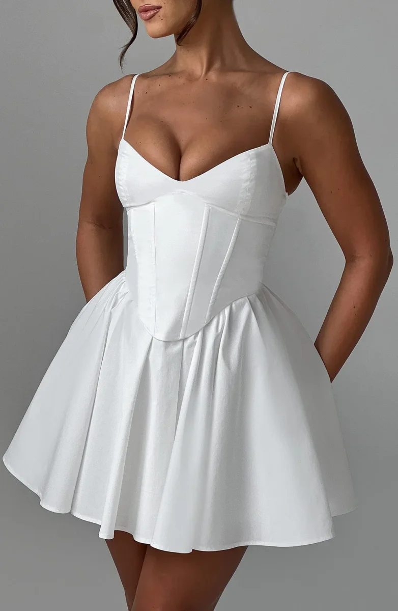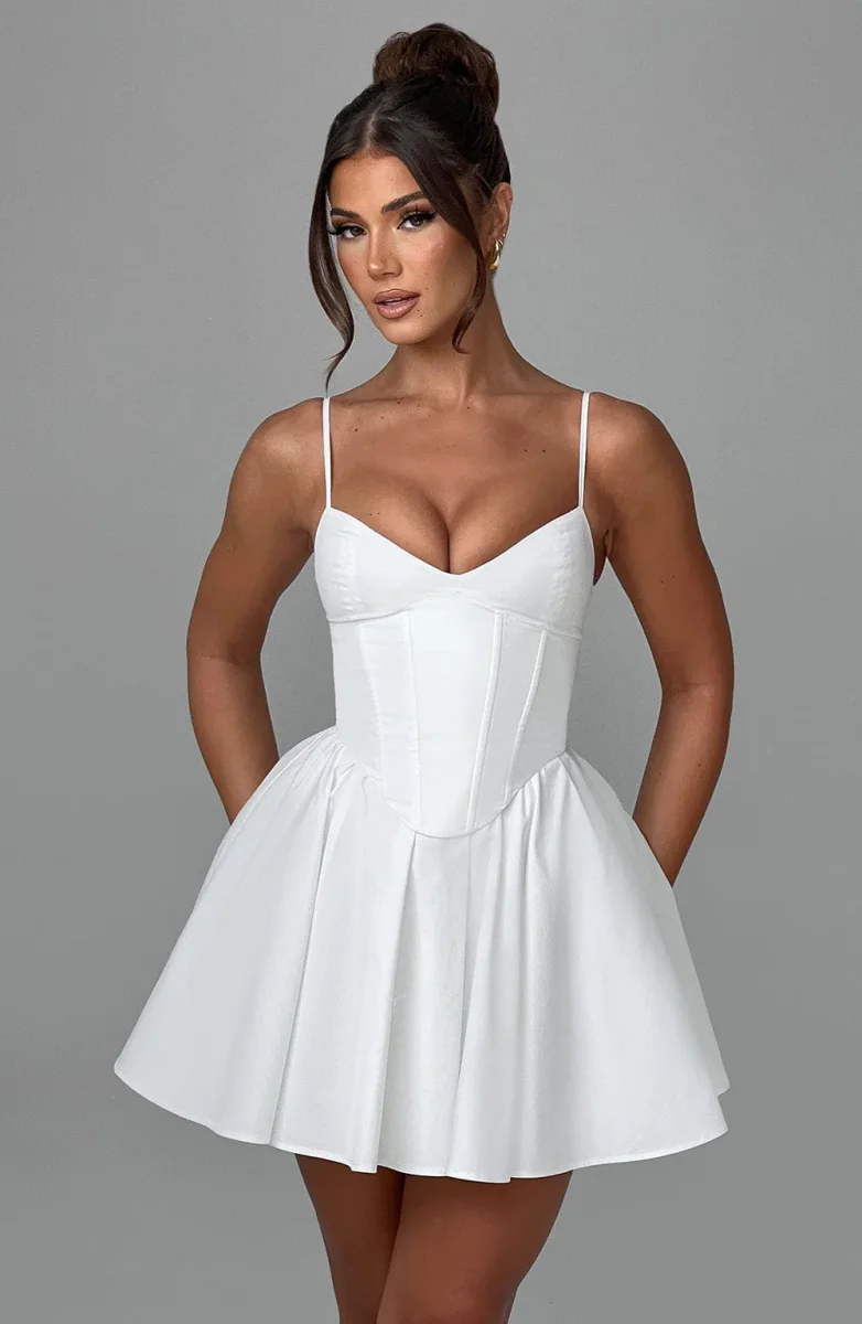 Cette robe bustier évasée à bretelles fines met en valeur votre silhouette avec son corset structuré et sa jupe fluide.