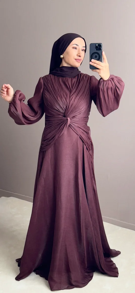 Les détails de drapés croisés sur les côtés soulignent la silhouette avec sophistication.