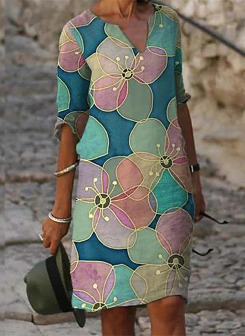 Entrez dans une sophistication sans effort avec cette robe midi pour femme magnifiquement conçue. Dotée d’une encolure en V flatteuse, de délicats motifs floraux et d’élégantes manches trois quarts, cette robe offre un équilibre parfait entre style et confort.