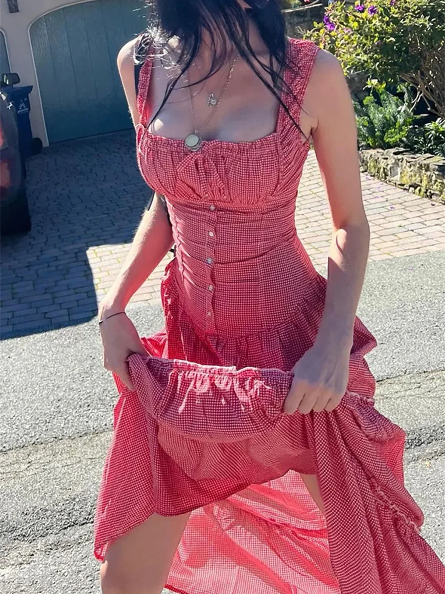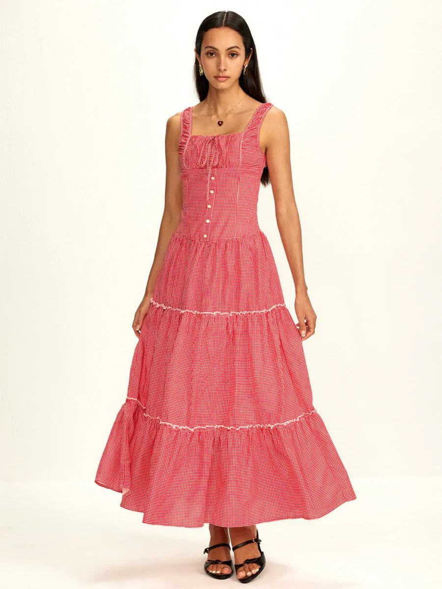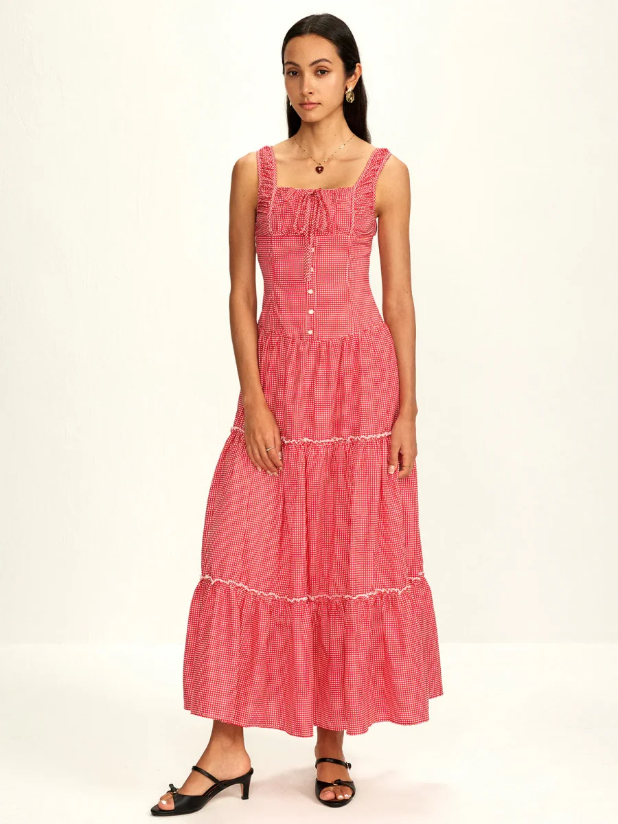 Cette robe longue à carreaux rouges capture l’esprit vintage avec une touche de féminité moderne.