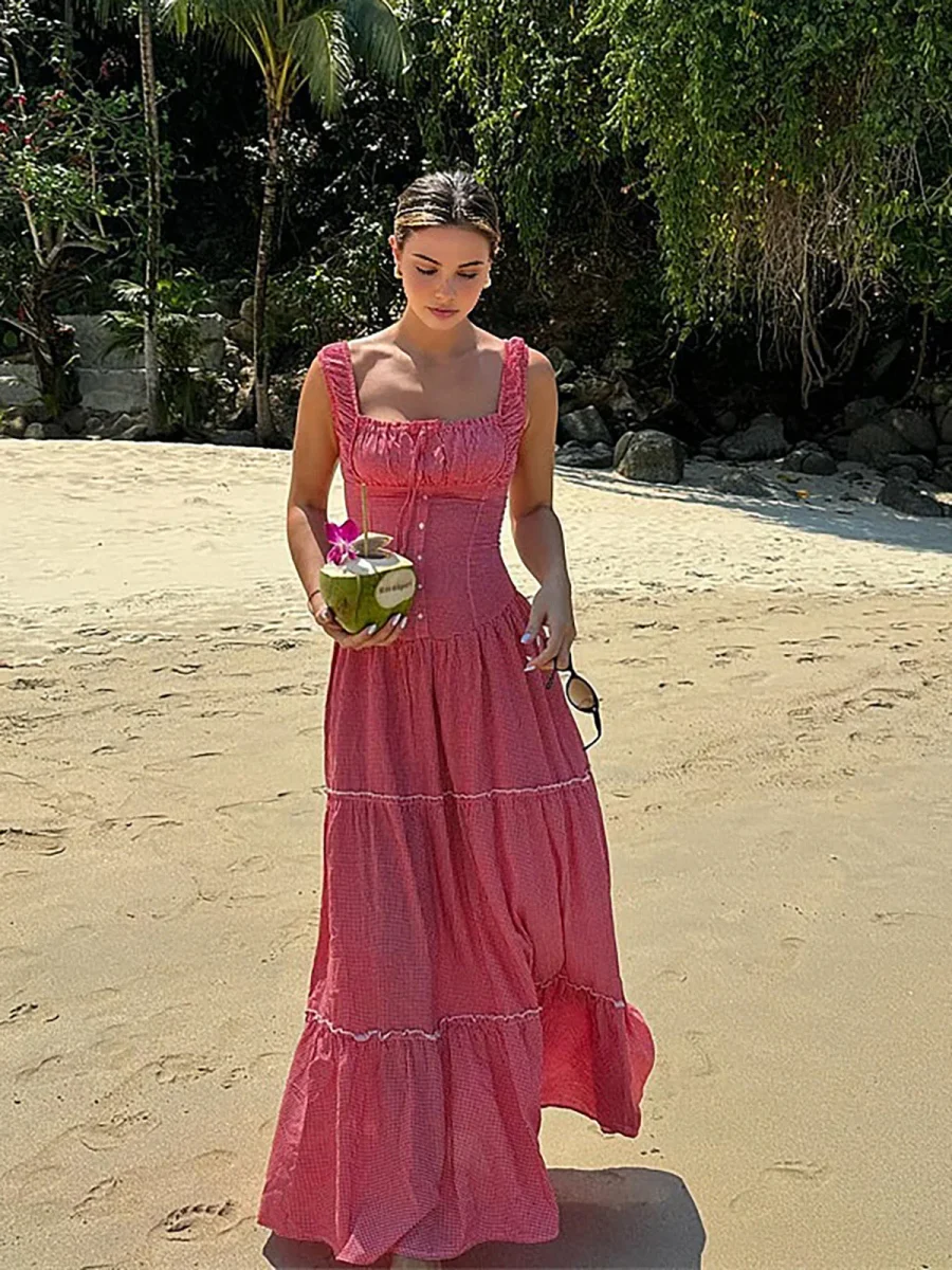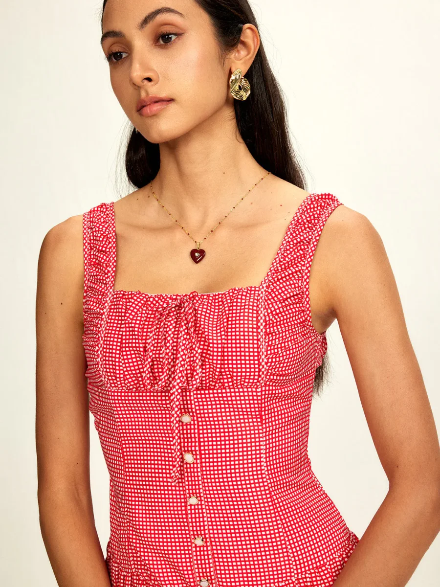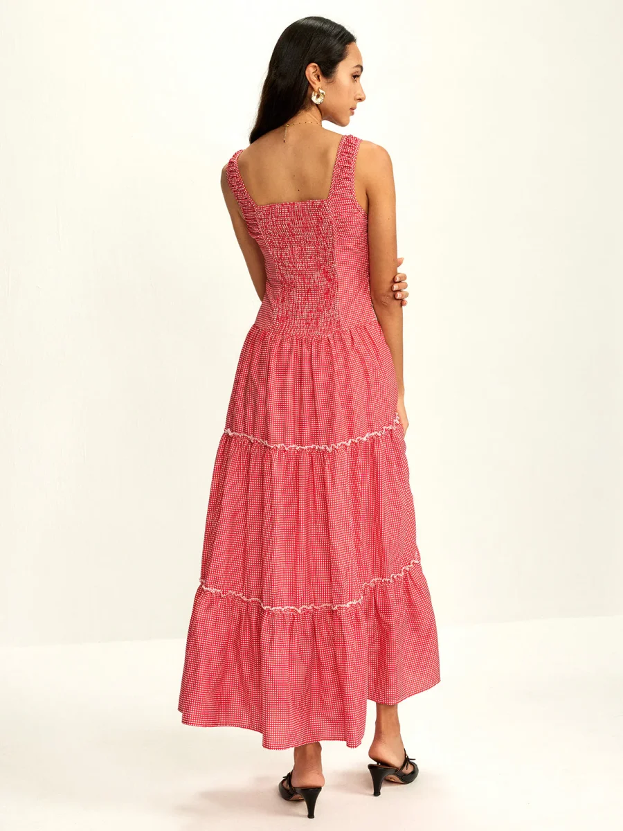Cette robe longue à carreaux rouges capture l’esprit vintage avec une touche de féminité moderne.