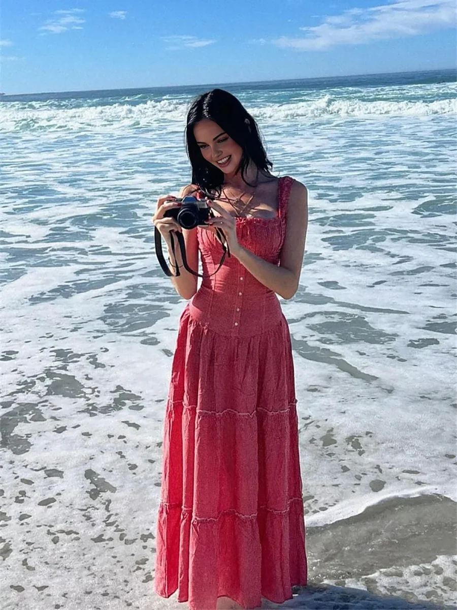 • Design : Robe longue à bretelles larges et boutons décoratifs