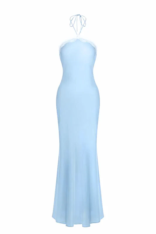 Robe longue à licou en satin – Bleu