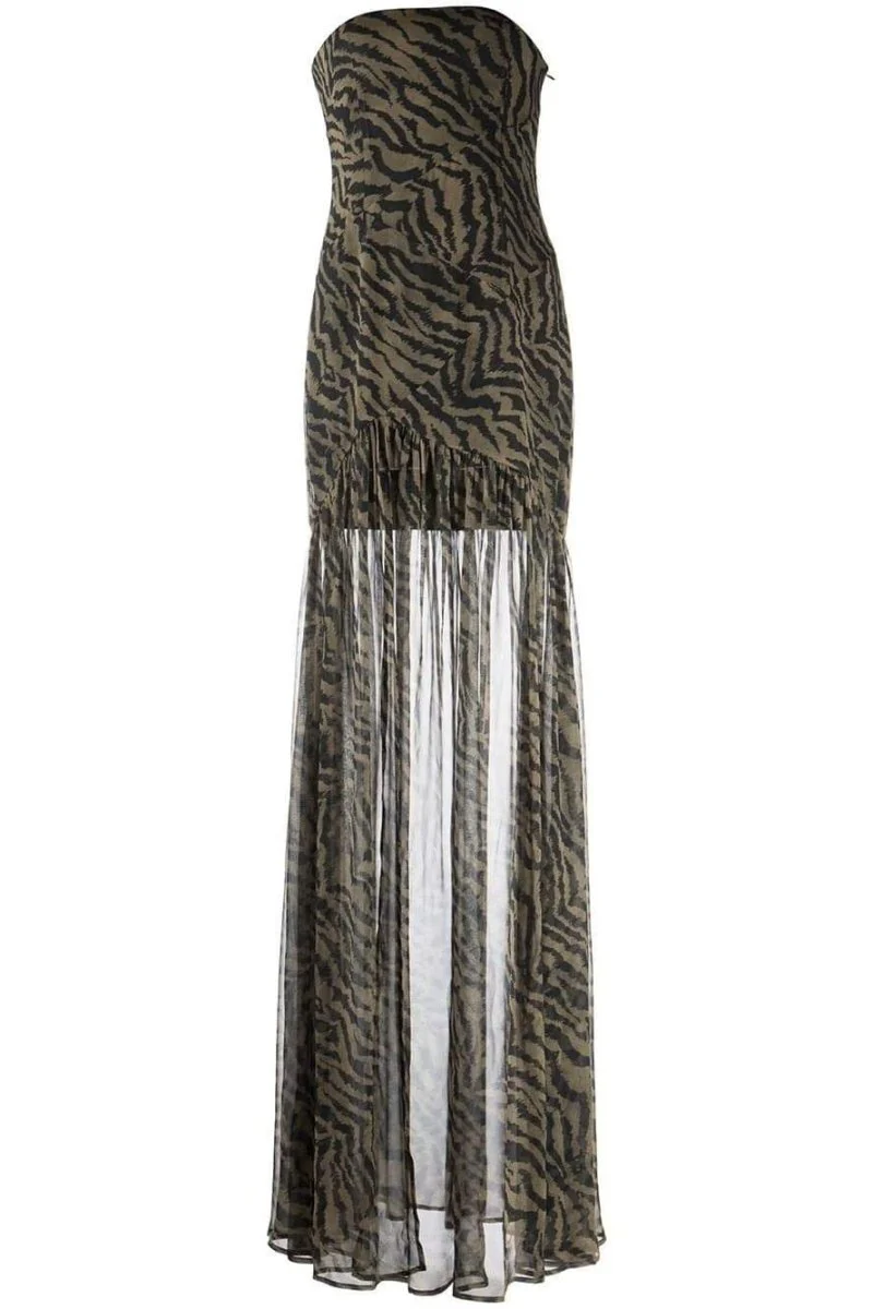 Cette robe longue bustier à imprimé animal séduit par son élégance sauvage et sa fente ultra flatteuse.