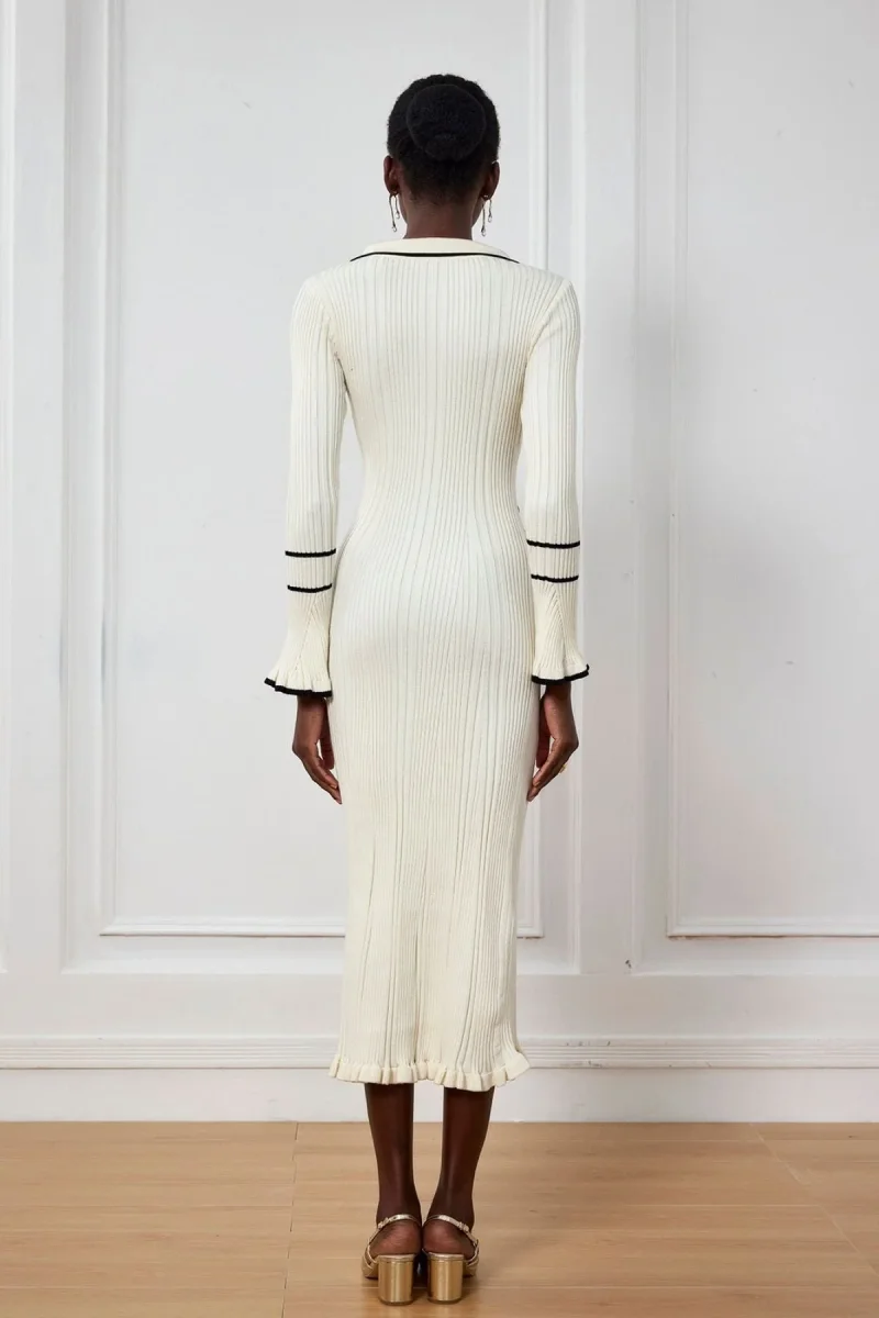 Cette robe longue en maille crème combine style classique et détails raffinés.