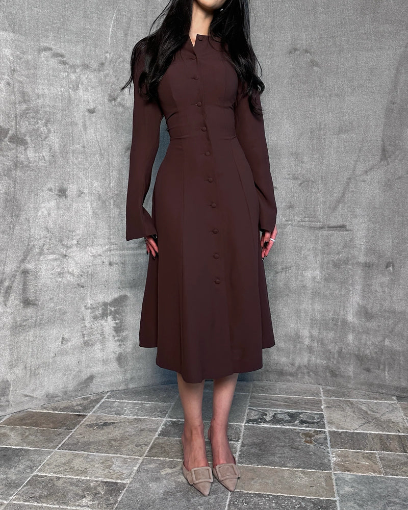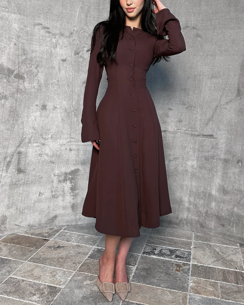 Cette robe midi boutonnée à la coupe structurée est la définition même de la féminité raffinée.