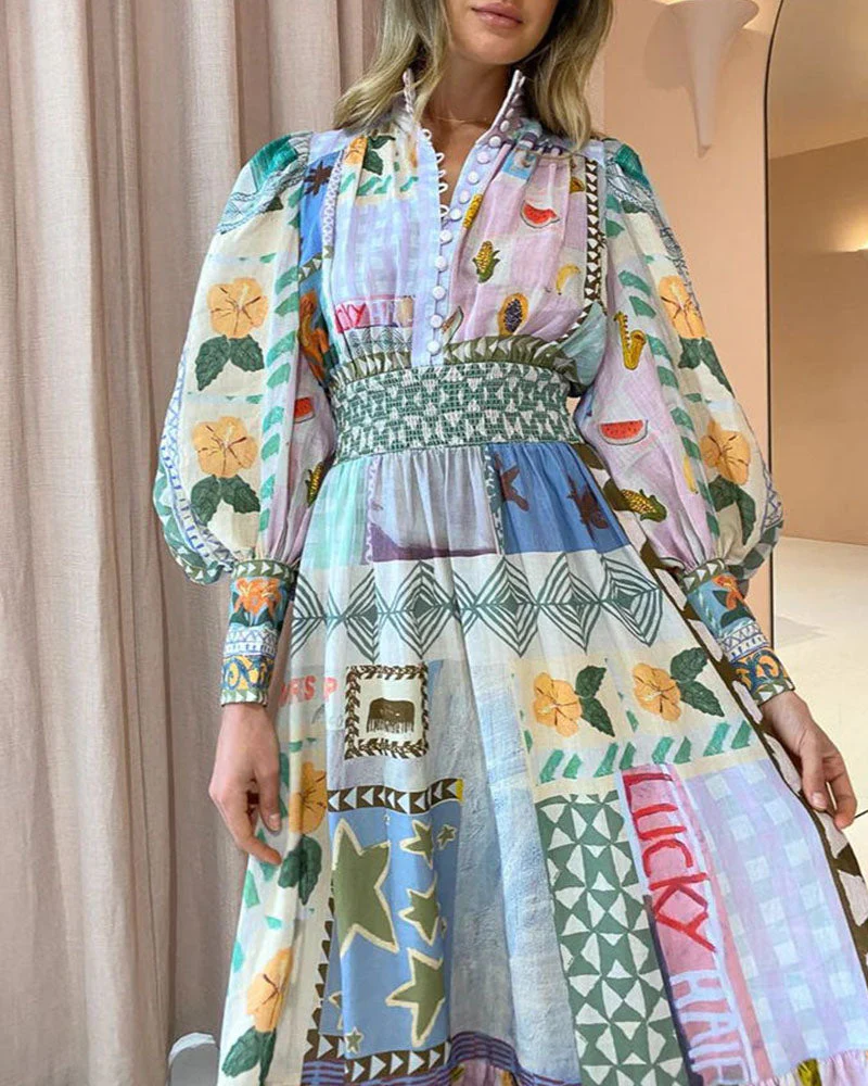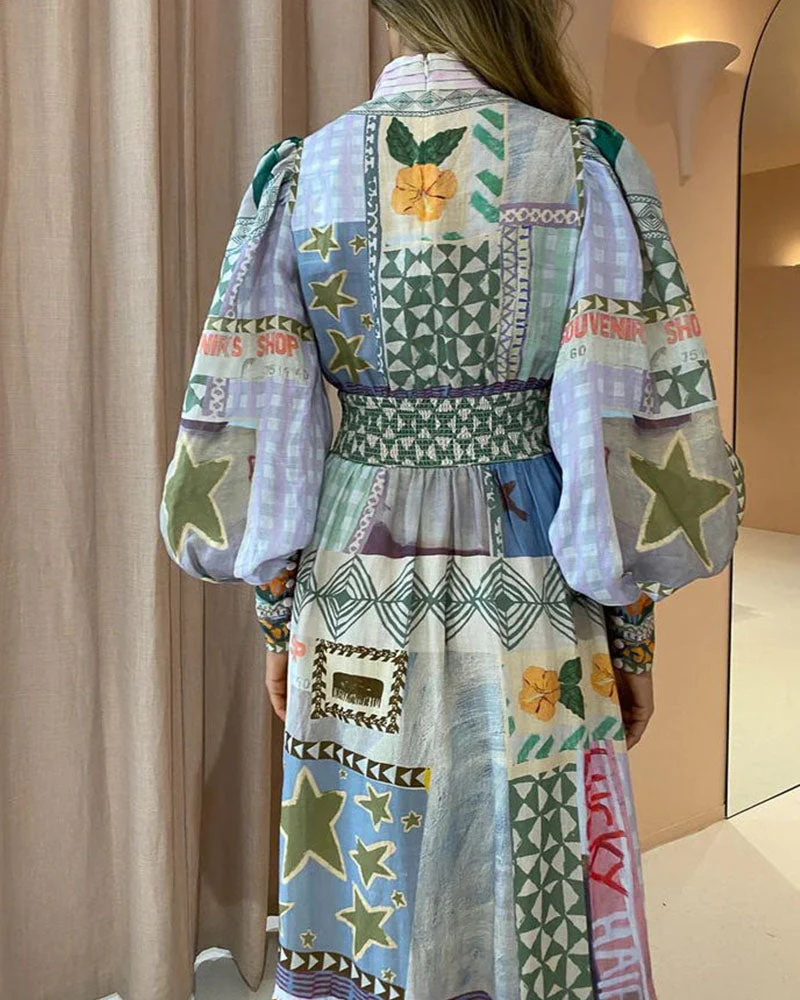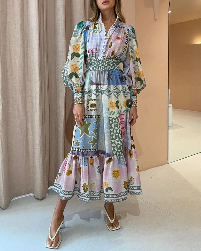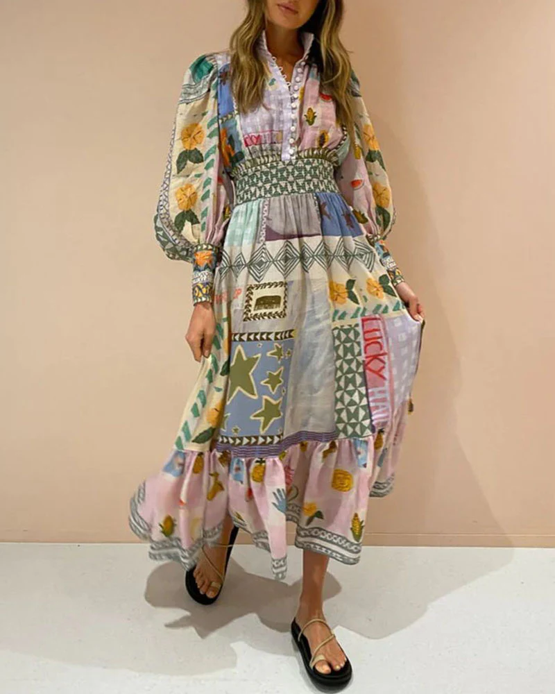 Cette robe midi au motif patchwork coloré attire tous les regards avec sa silhouette bohème et ses détails soignés.