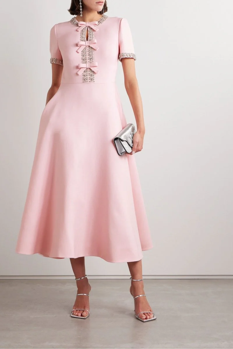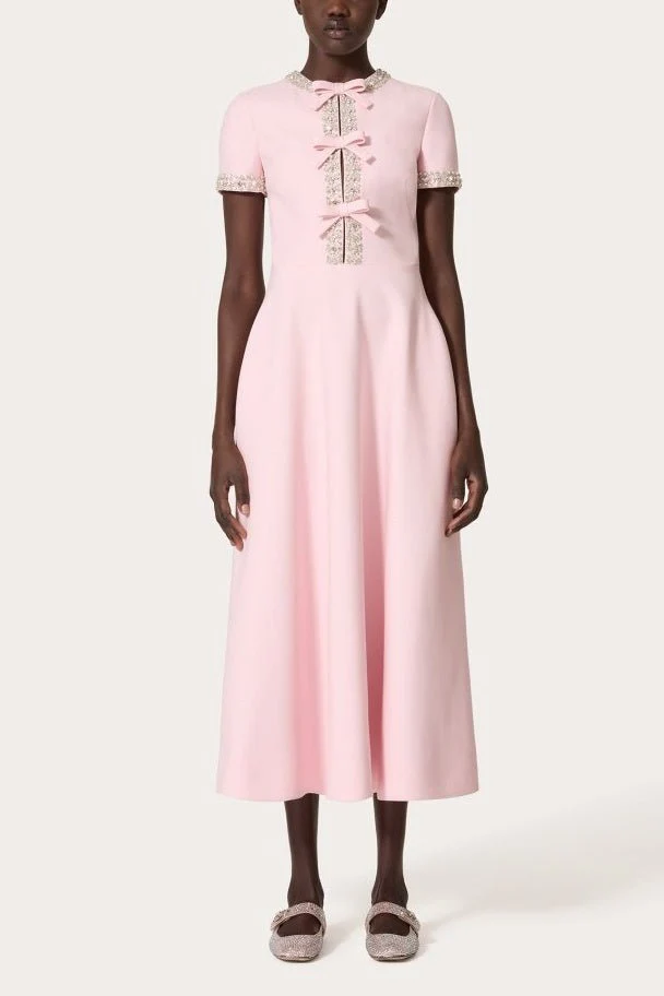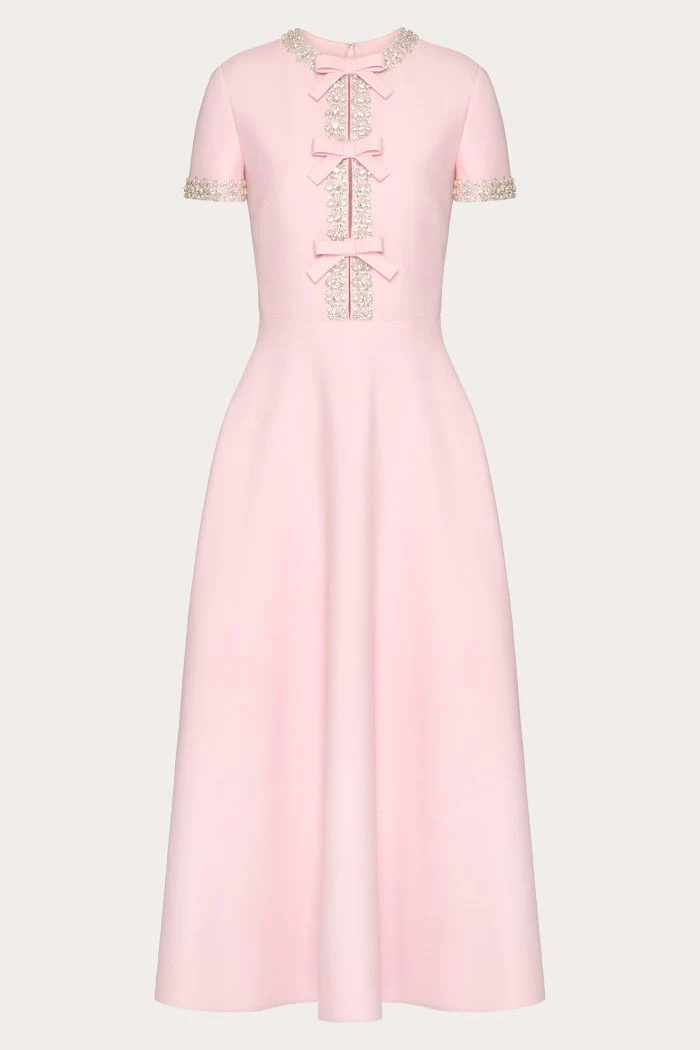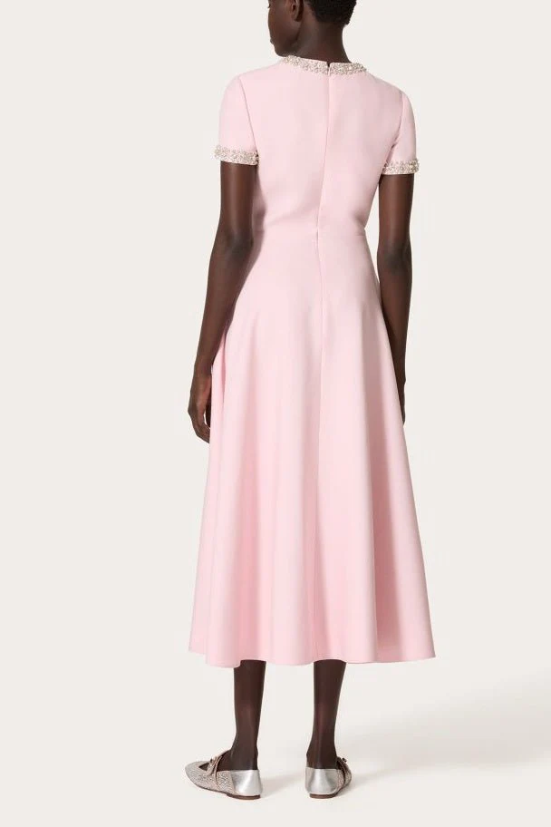 Cette robe midi rose poudré au style vintage revisité séduit par ses détails raffinés et sa coupe structurée.