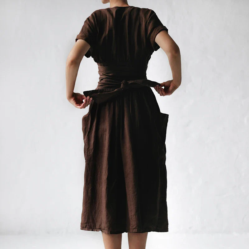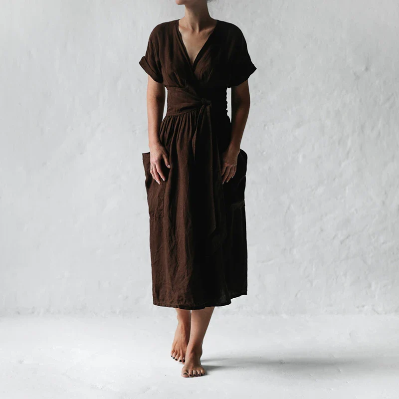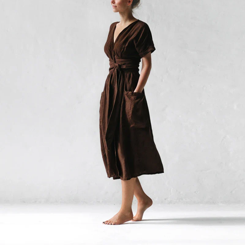 Cette robe midi portefeuille en lin brun allie simplicité, douceur et raffinement naturel.