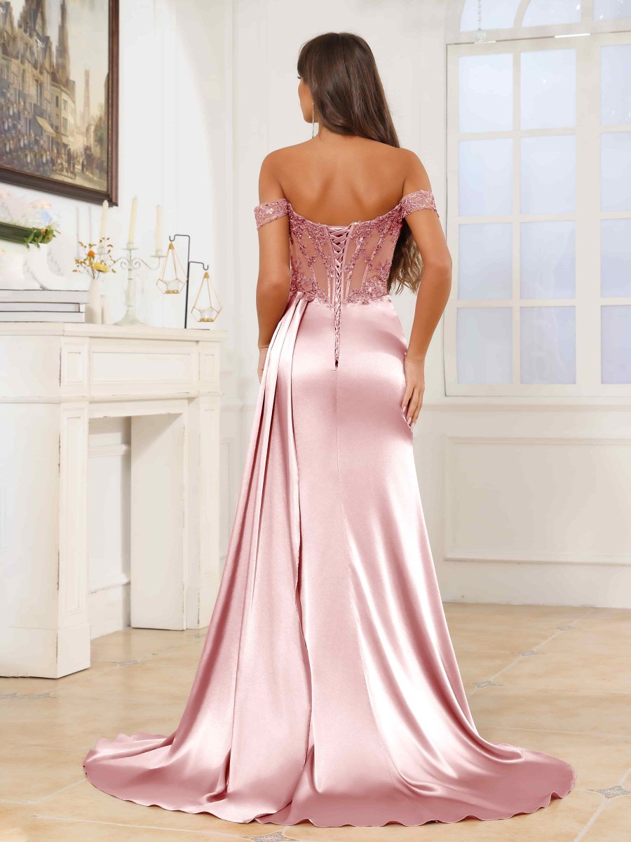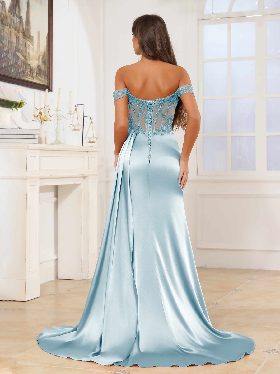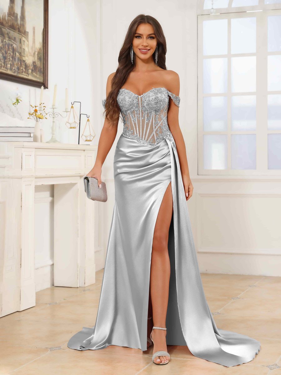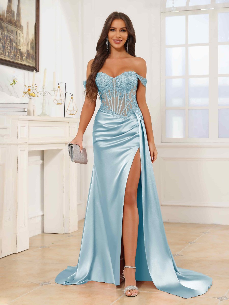 Robes De Bal En Satin À Épaules Dénudées Corset Ruché Fente À Jambe Karla