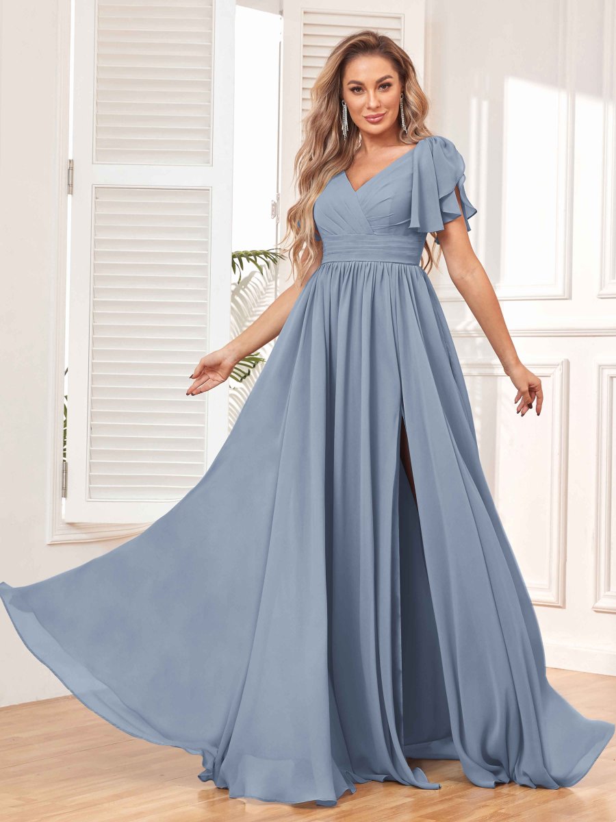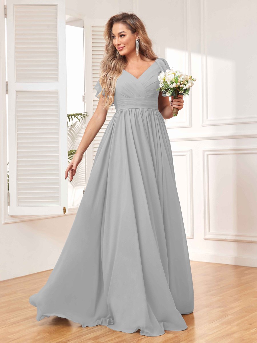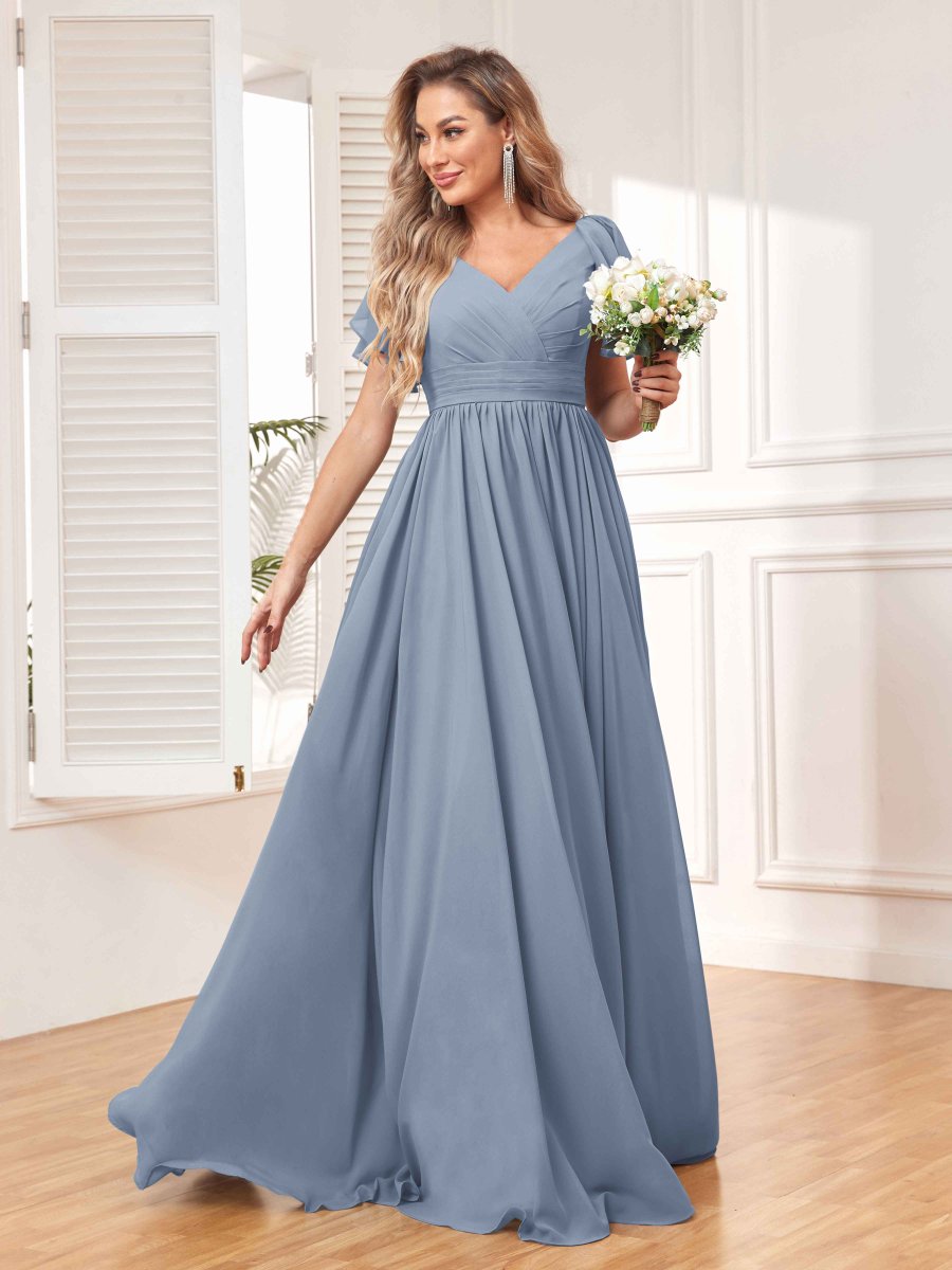 Rayonnez de beauté et de grâce avec la superbe robe de demoiselle d’honneur en mousseline de soie froncée ligne A Natalie de Pomuyoo.fr. La silhouette trapèze, les détails froncés et le tissu en mousseline fluide en font un choix idéal pour une soirée nuptiale à la recherche d’un look époustouflant et flatteur.