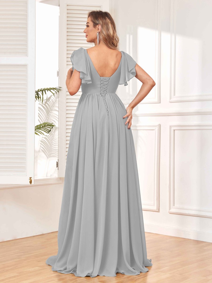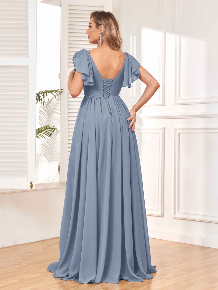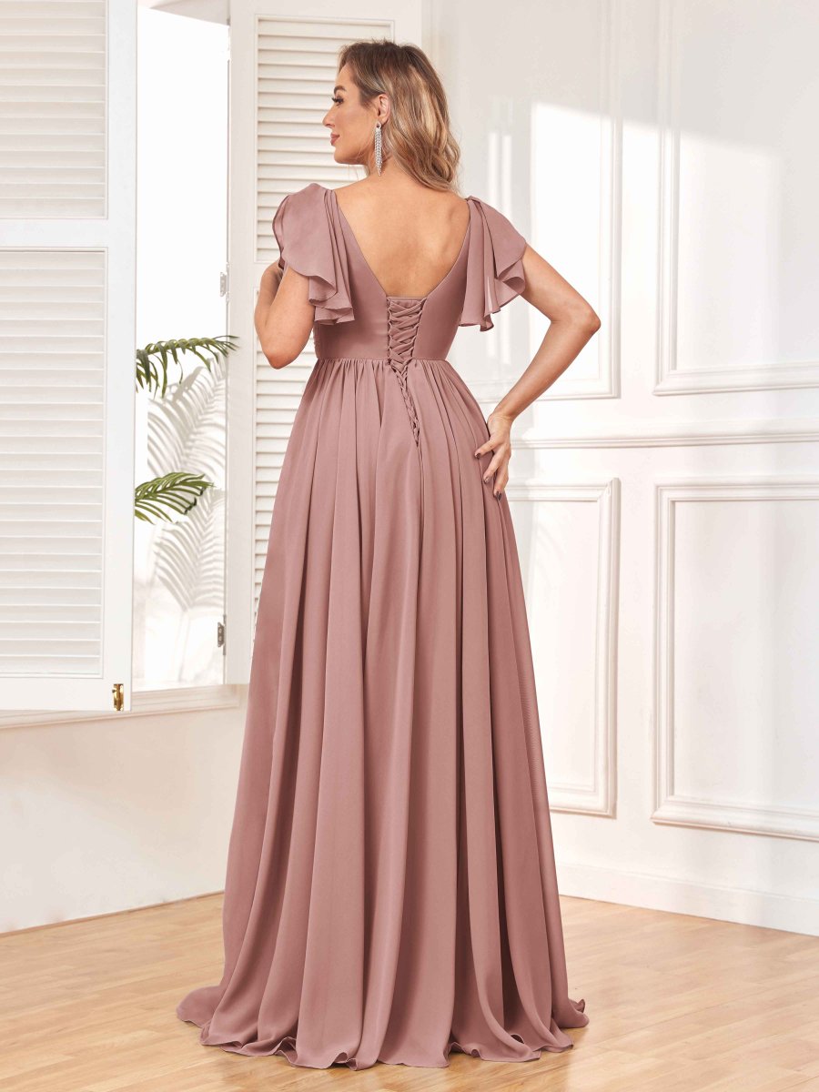 Rayonnez de beauté et de grâce avec la superbe robe de demoiselle d’honneur en mousseline de soie froncée ligne A Natalie de Pomuyoo.fr. La silhouette trapèze, les détails froncés et le tissu en mousseline fluide en font un choix idéal pour une soirée nuptiale à la recherche d’un look époustouflant et flatteur.