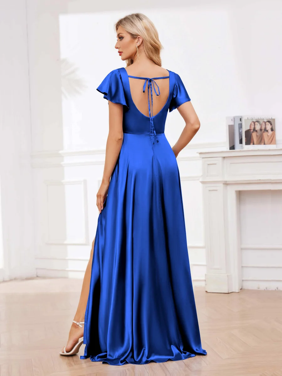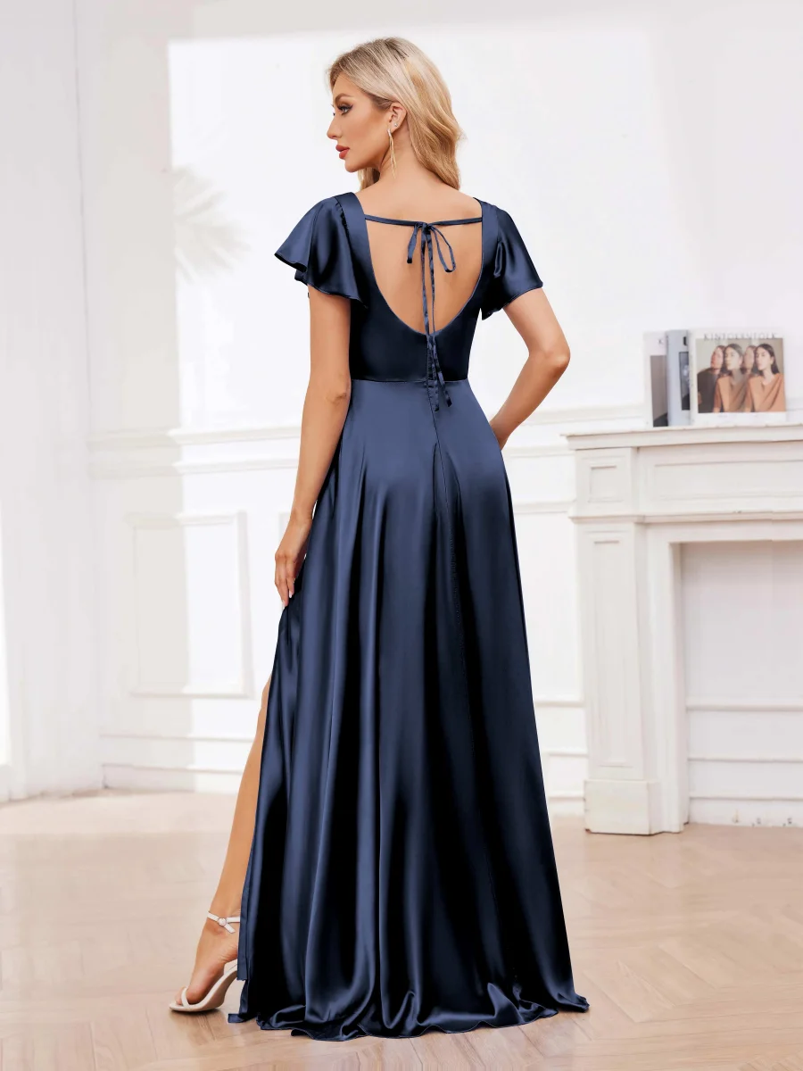 - La robe de demoiselle d’honneur Cassandra en satin avec carré et fente à la jambe apporte une touche de sophistication à votre garde-robe de fête.