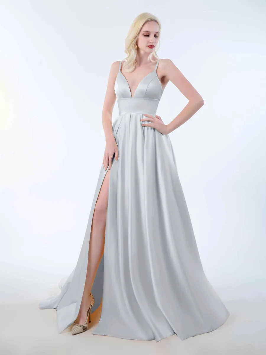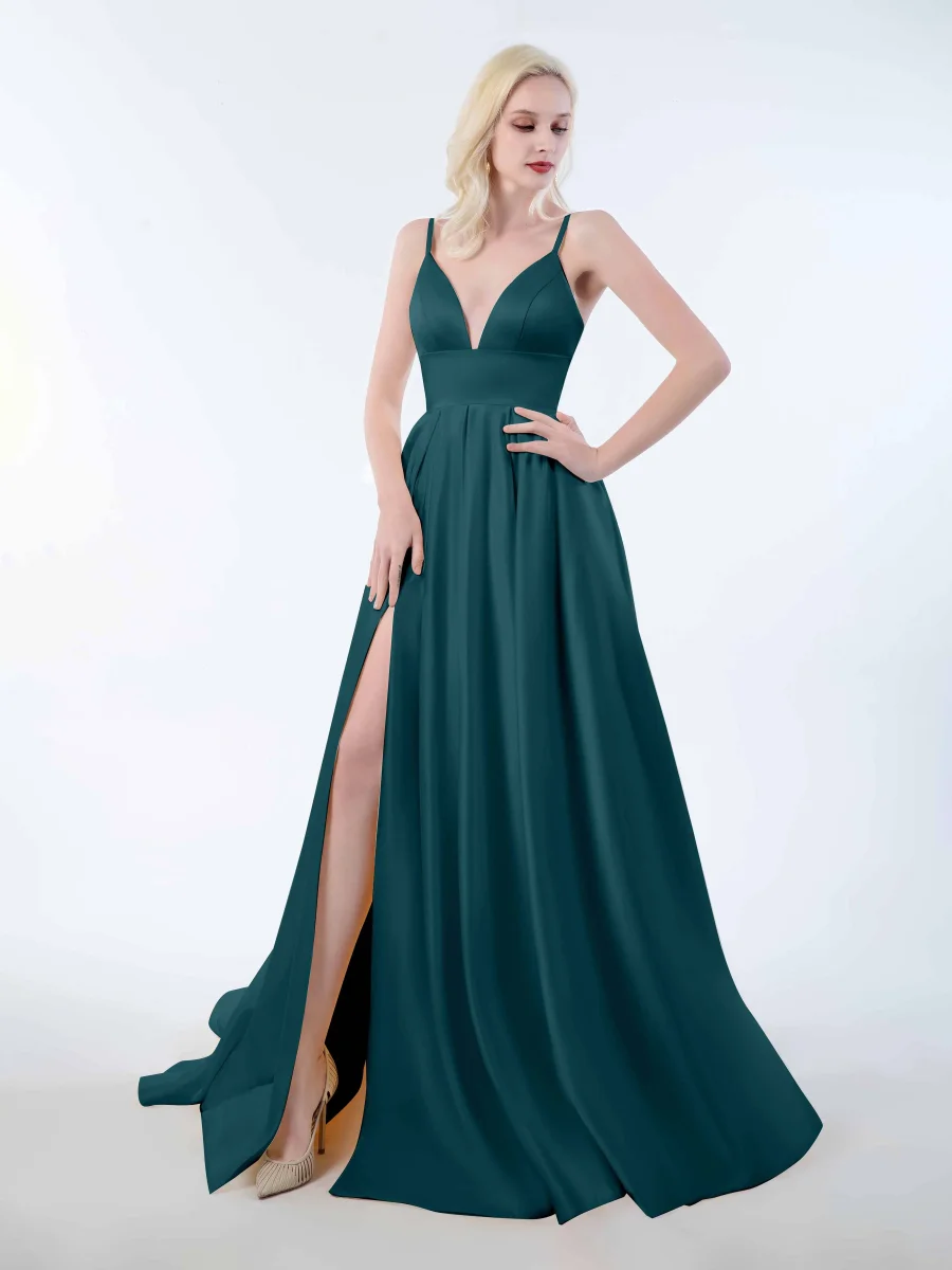 Robes En Satin À Fente À Jambe Bretelles Spaghetti Et Col En V Amy