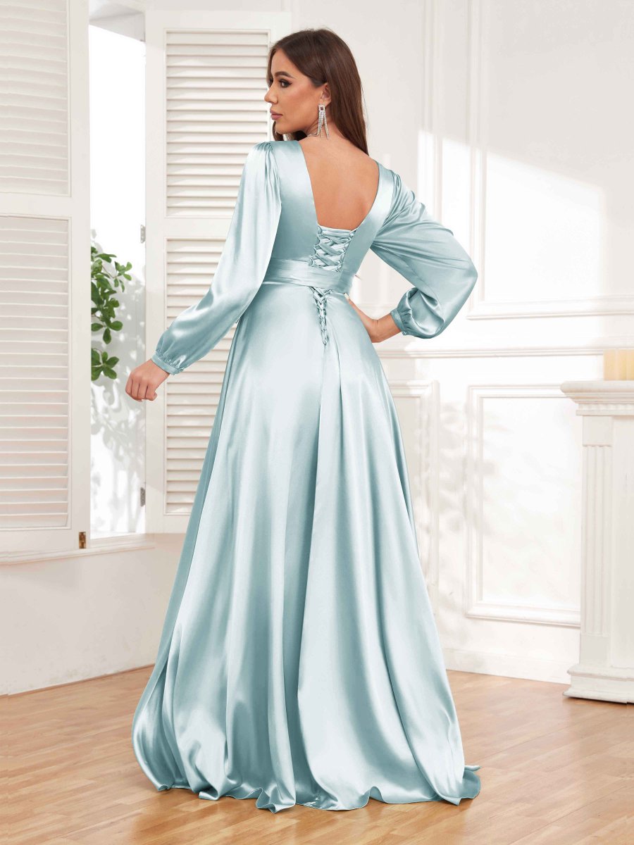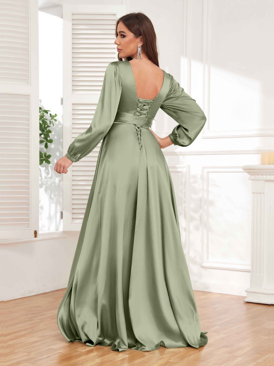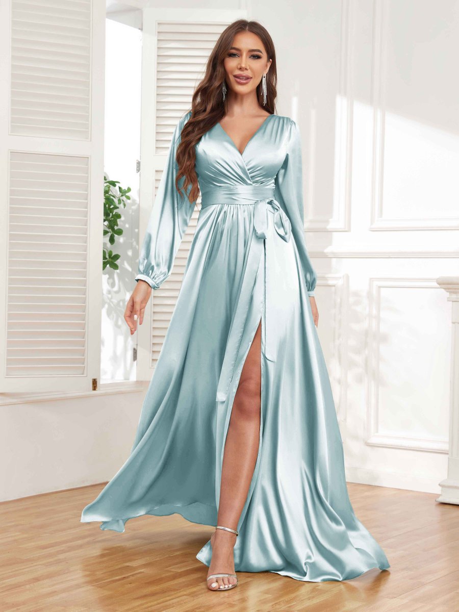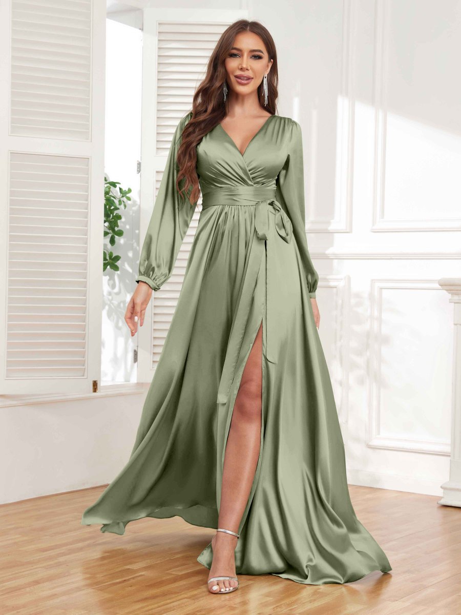Incarnez la grâce et la sophistication avec la robe formelle à manches longues en satin. Le détail fendu ajoute une touche de sensualité, tandis que la ceinture incluse cintre la taille et met en valeur votre silhouette. Cette robe est parfaite pour celles qui veulent respirer l’élégance et faire une déclaration lors de tout événement formel.