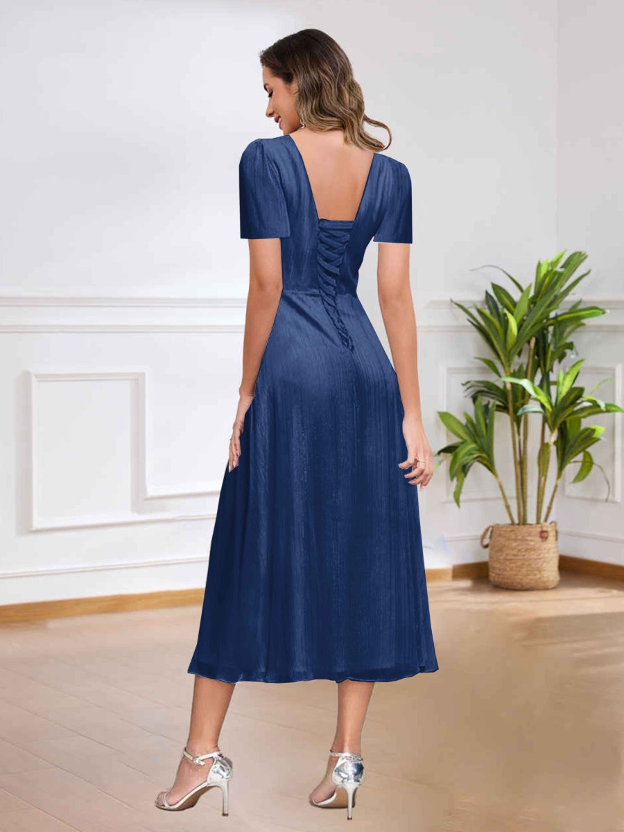 Cette robe pour la mère de la mariée est charmante avec ses volants, qui donnent un air léger et féminin. Les lacets ajoutent un détail intéressant et un peu de romantisme. Sa longueur de mollet est élégante et pratique, la rendant idéale pour les cérémonies de mariage, permettant à la mère de la mariée de paraître gracieuse.