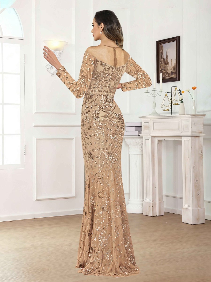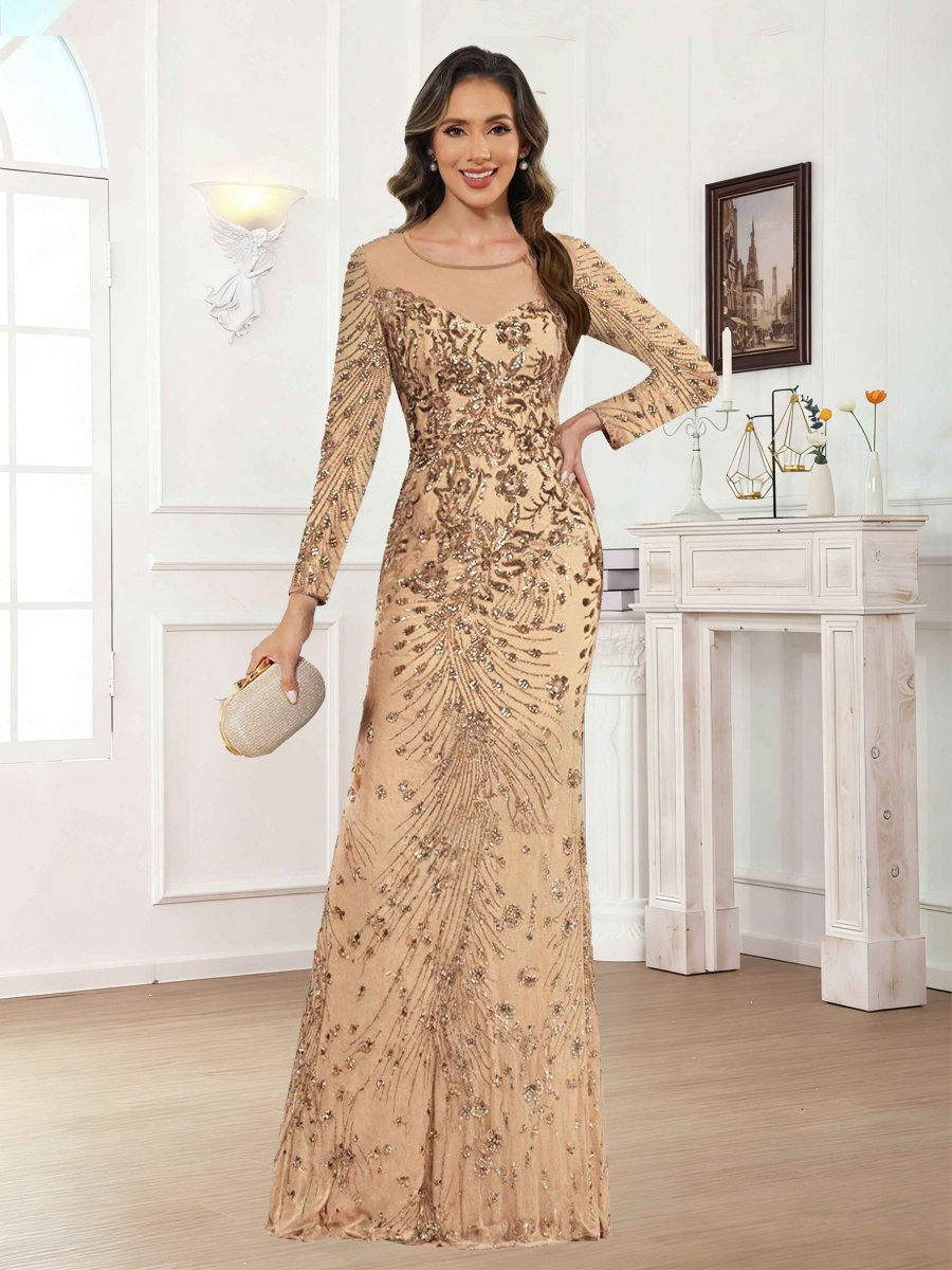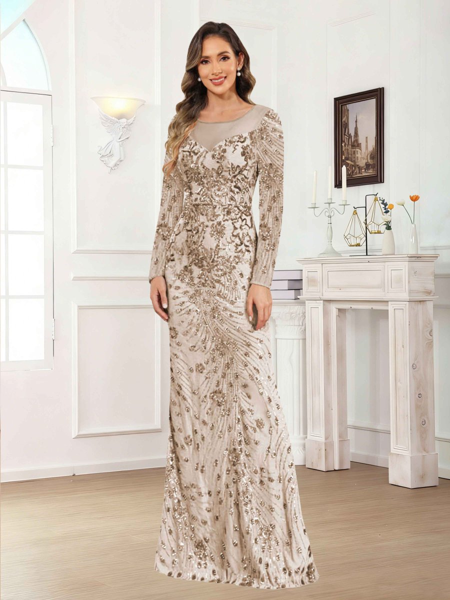 Robes Mère De La Mariée En Paillete À Col Rond Manches Longues Longueur Au Sol Vraelara