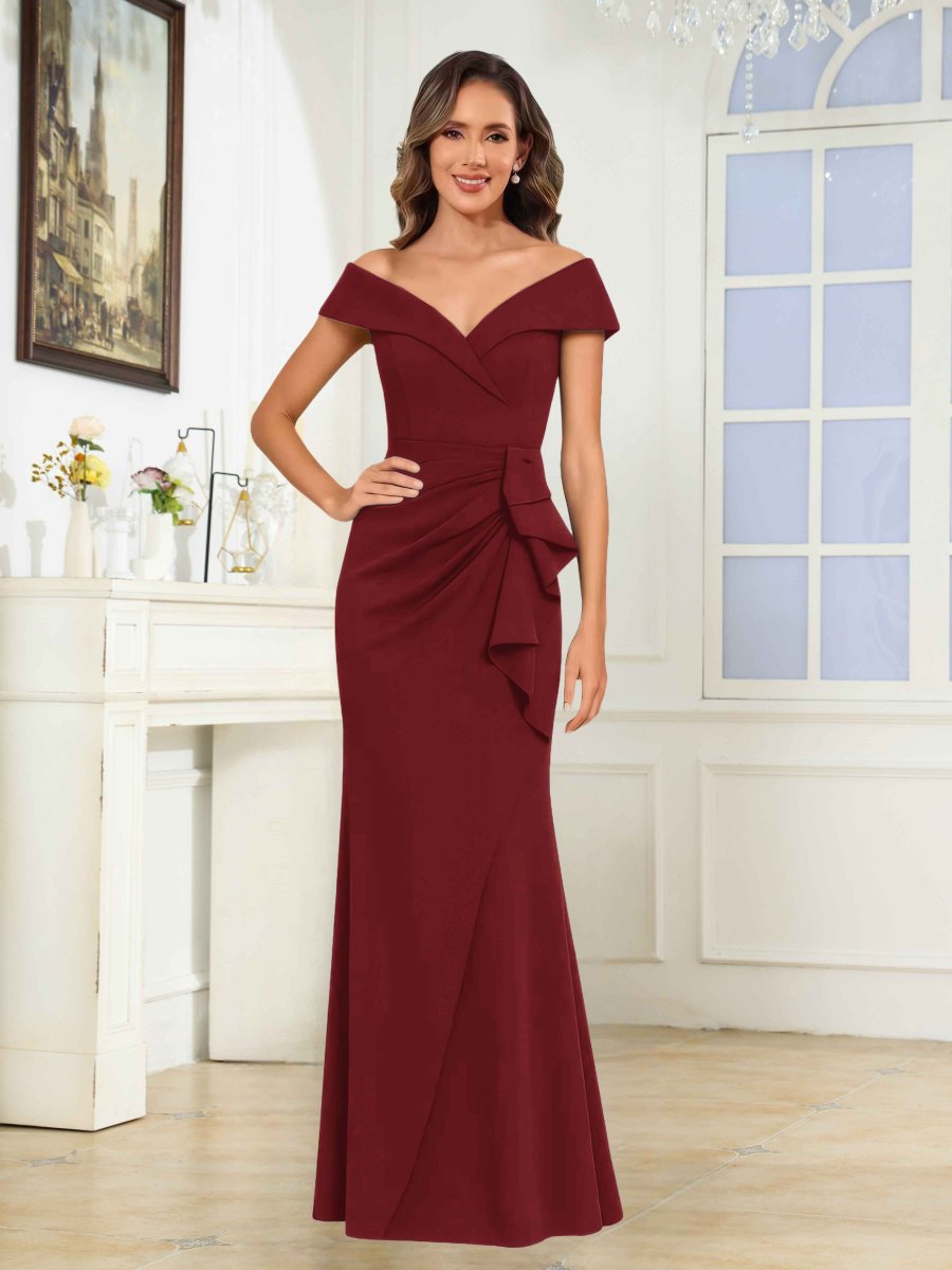 Mère De Mariée En Velours À Romantique Gaine Épaules Dénudées Manches Longues Longueur Au Sol Vesper