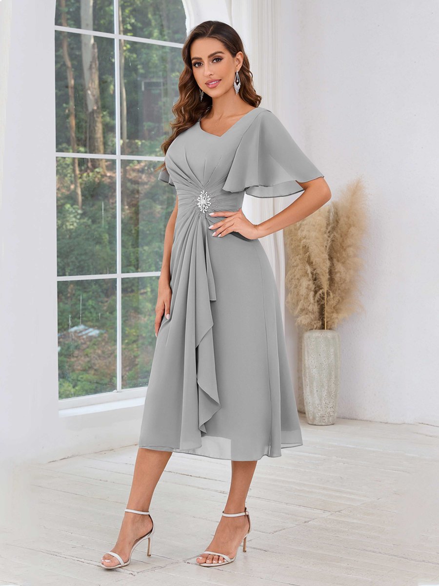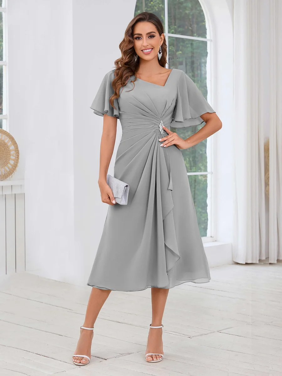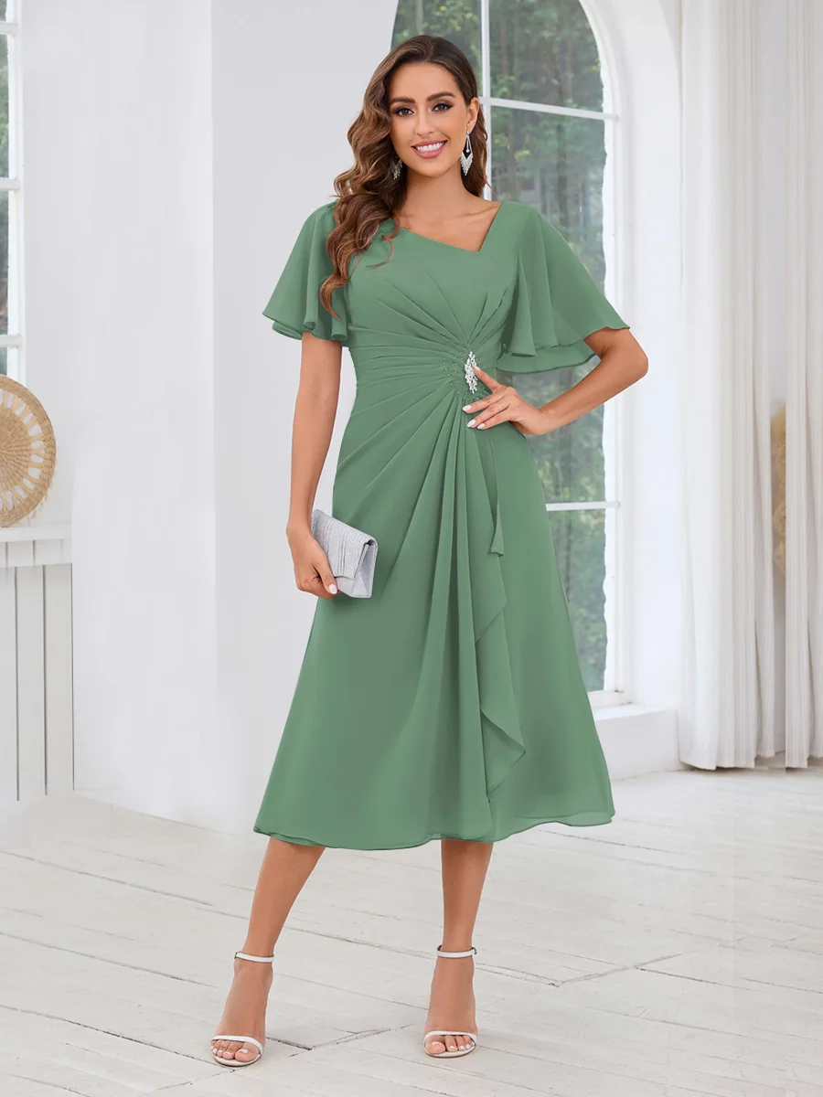 Robes Mère De La Mariée Midi À Ruché Manches Courtes Perles Bonnie