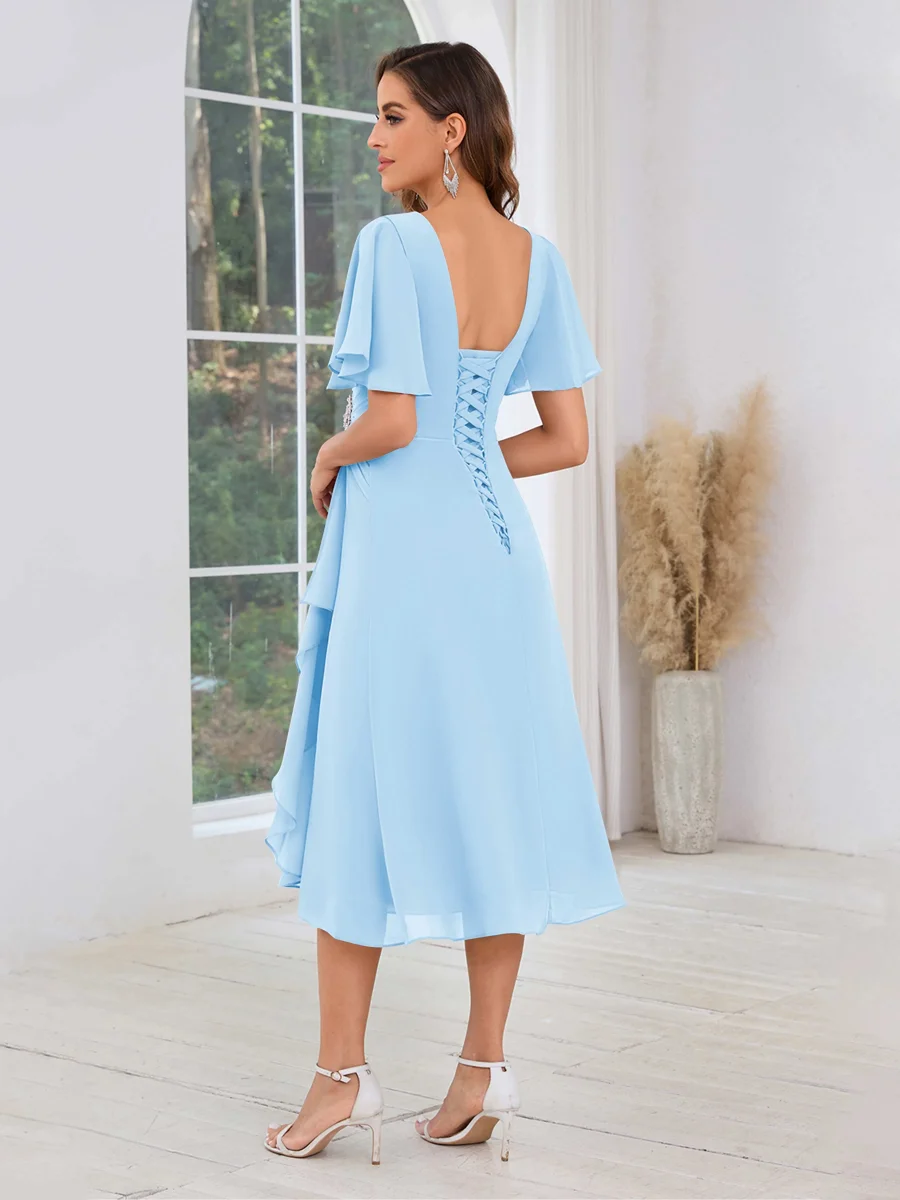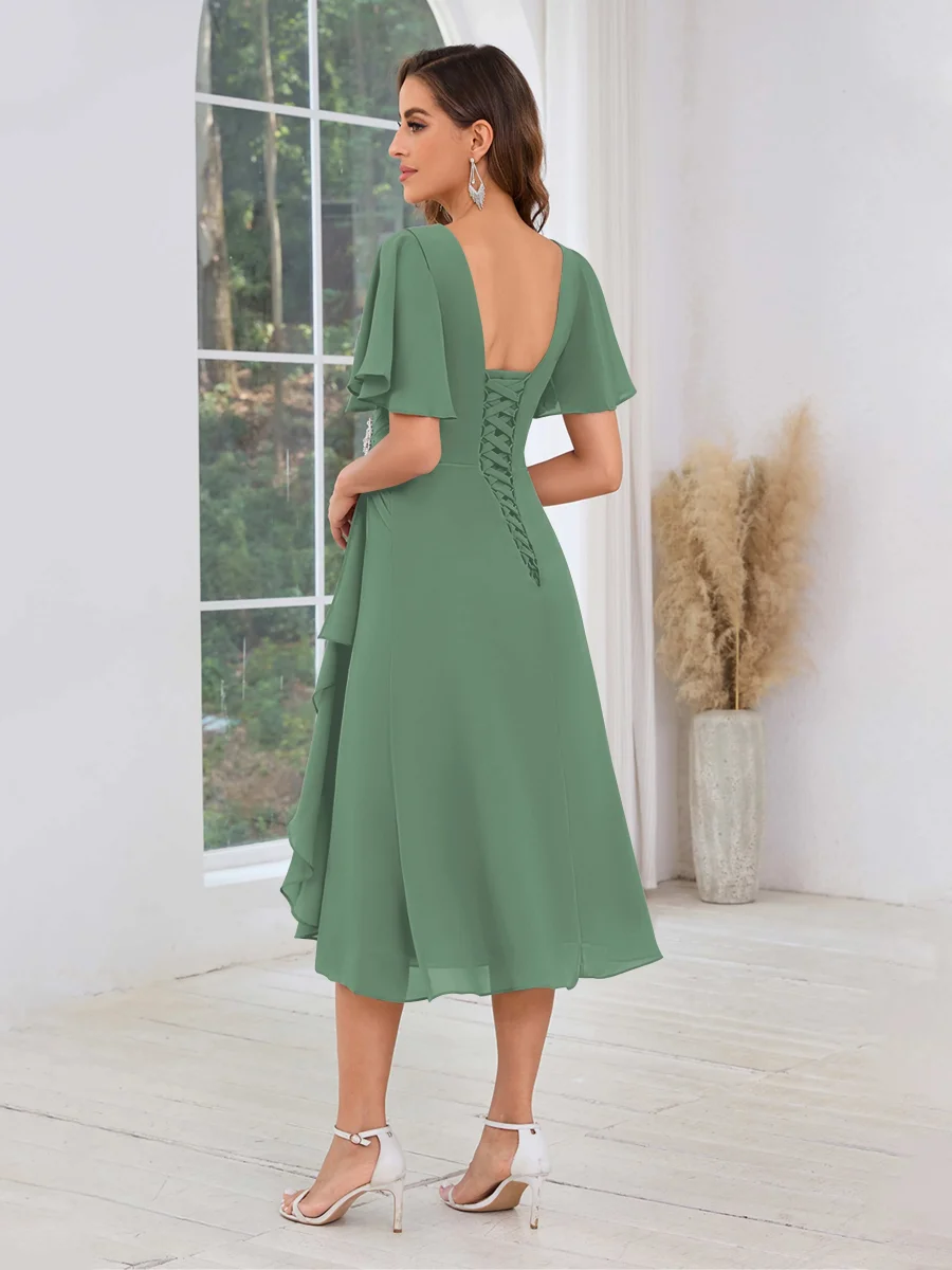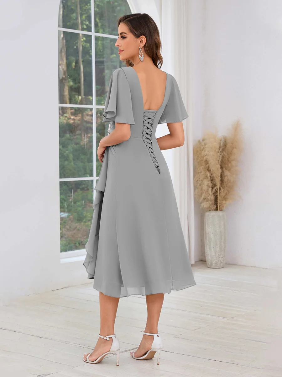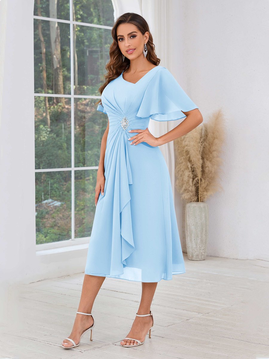 Robes Mère De La Mariée Midi À Ruché Manches Courtes Perles Bonnie