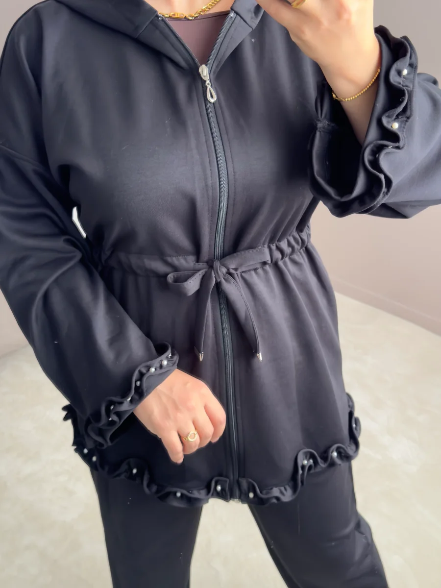 Les manches et les bords de la veste sont ornés de délicates perles imprimées ainsi que de petits volants, apportant une touche féminine et sophistiquée à votre tenue.