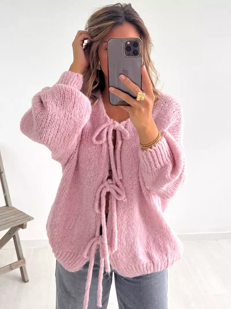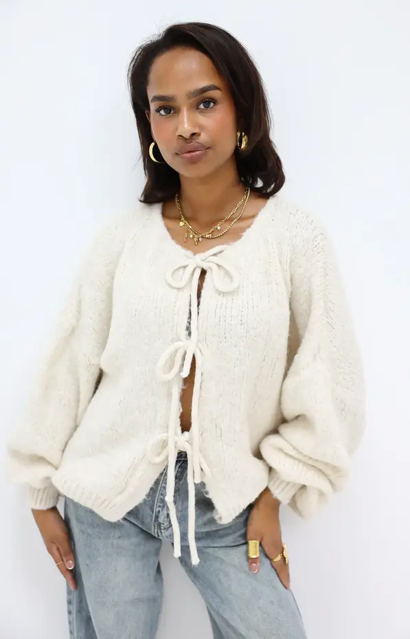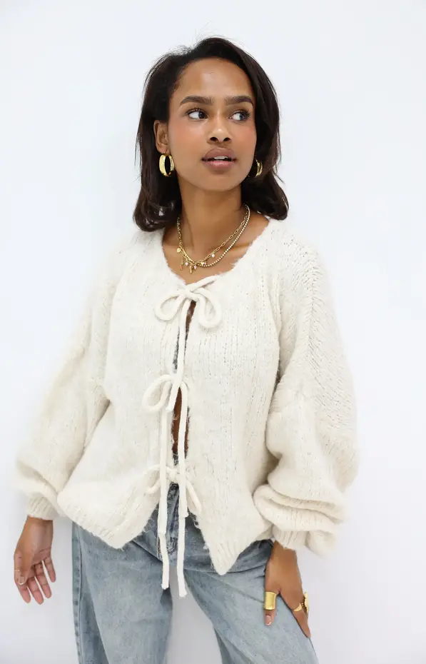 This knitted cardigan features pretty ties to tie at the front and voluminous sleeves for a silhouette that’s both relaxed and assertive.