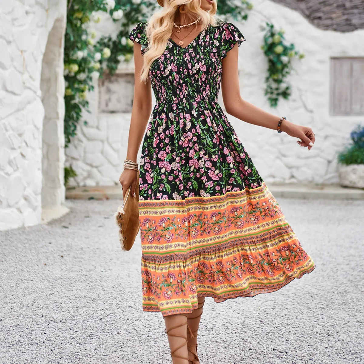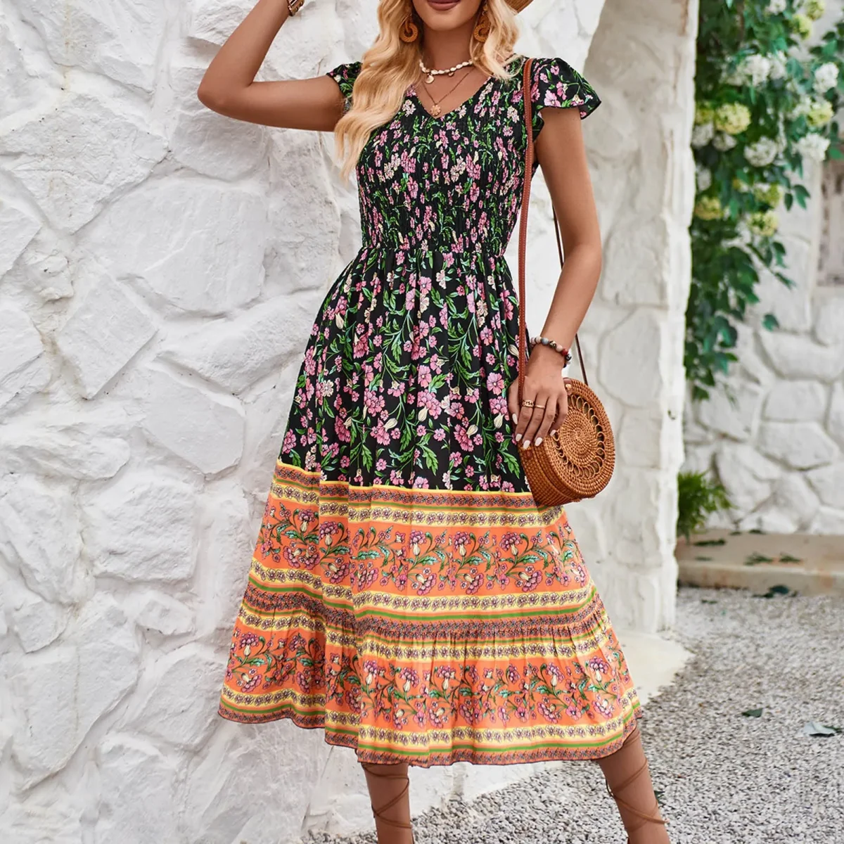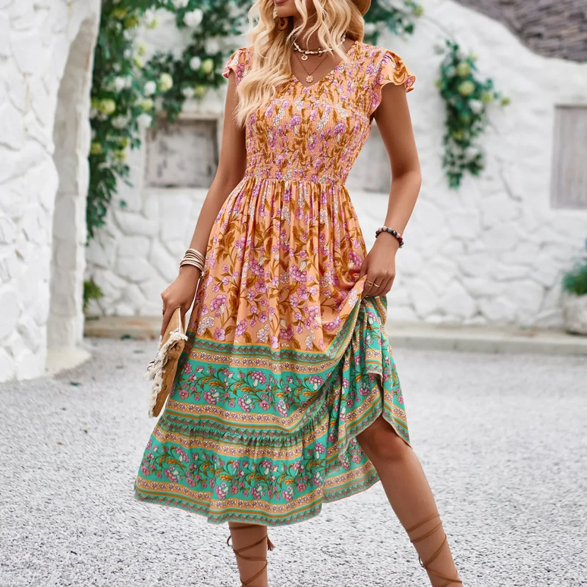 The fitted, smocked bodice emphasizes the waist, while the full skirt adds movement and lightness.