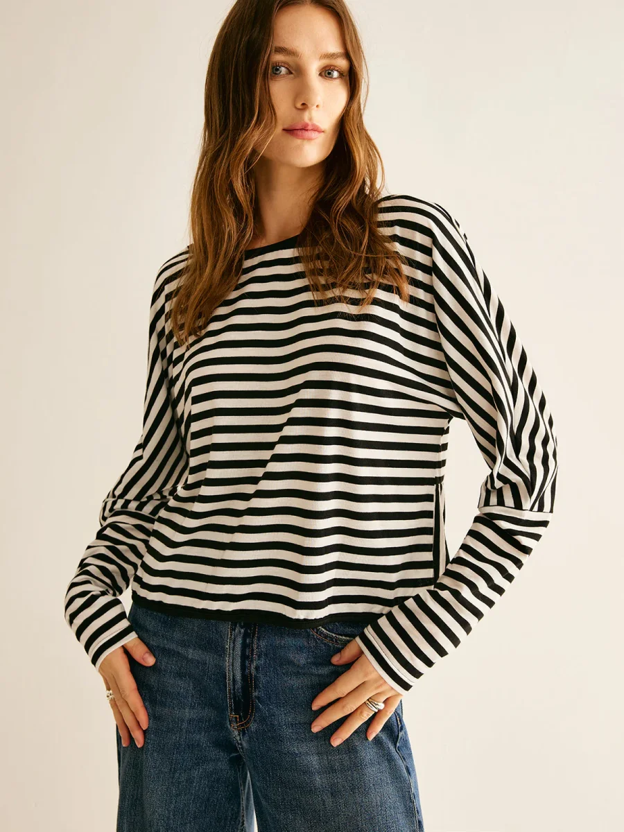 This long-sleeved black and white striped tee is a casual dressing essential, easy to match with all your looks.