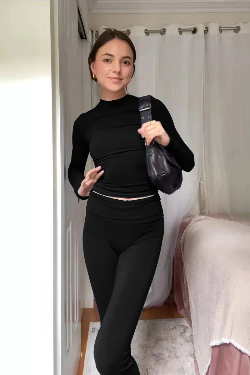 The long-sleeved sweater hugs the bust, while the slightly flared pants enhance the silhouette while offering great freedom of movement.