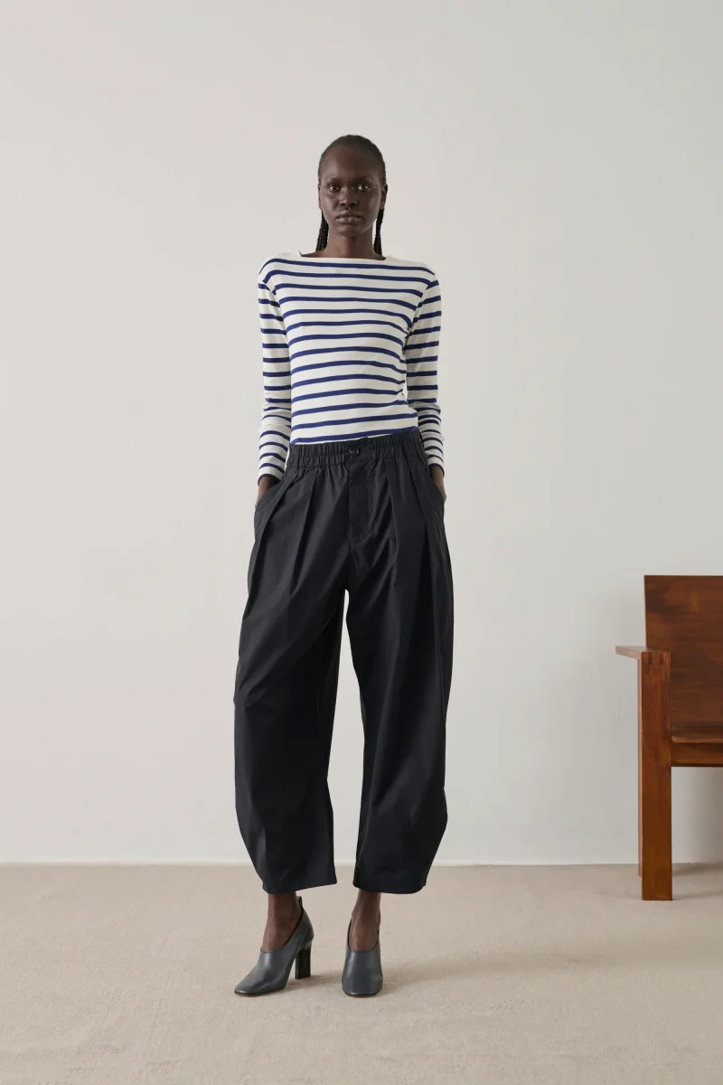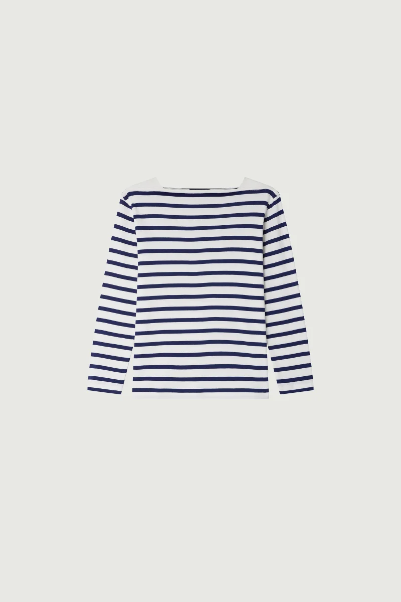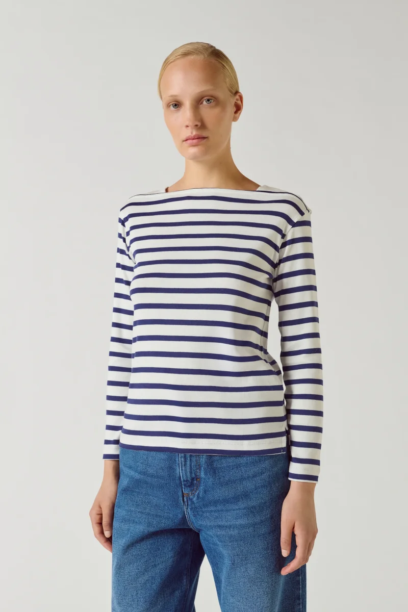 KATY est une marinière blanche et bleu marine en jersey de coton. Ce classique se distingue par des codes identitaires du vestiaire Soeur : col travaillé (coupe bateau finitions à hirondelles), coton dense et épais avec de la tenue, coton biologique. Un indispensable du vestiaire, confortable et intemporel.