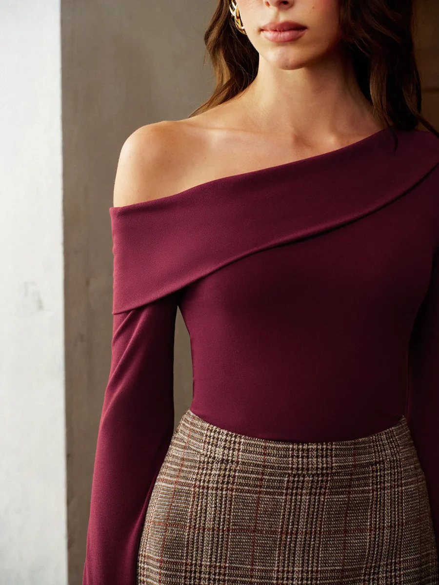 This burgundy top with asymmetrical draped neckline subtly reveals one shoulder for a look that’s both romantic and assertive.