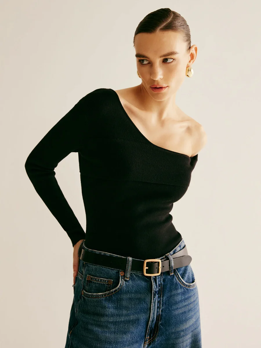 Top Noir Asymétrique | Épaule Dénudée | Élégance Minimaliste