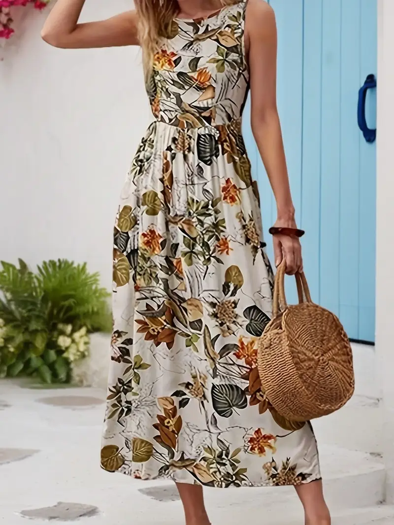 Invite summer into your wardrobe with this sleeveless tropical print maxi dress, perfect for sunny days.