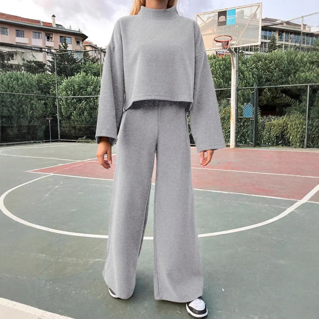 Comprising a slightly cropped top with wide sleeves and fluid high-waisted pants, it creates a modern, relaxed silhouette.