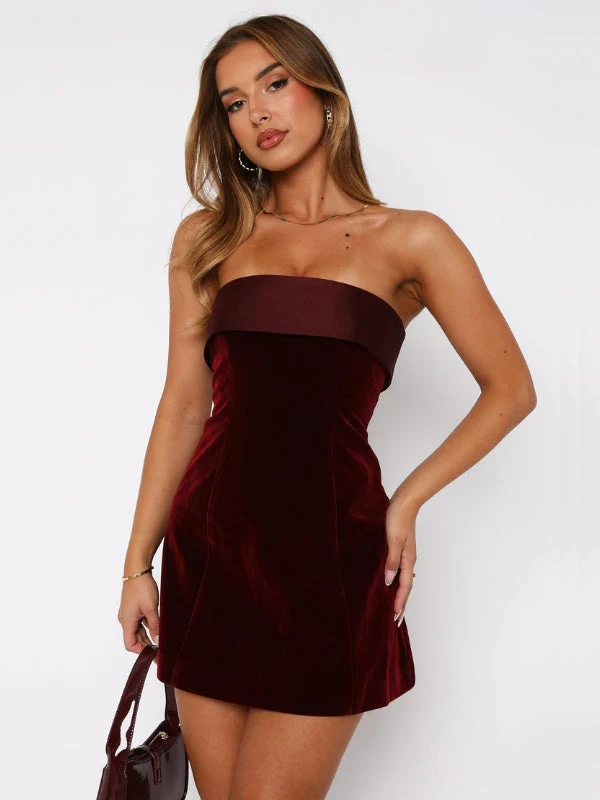The structured strapless cut enhances the décolleté, while the luxurious texture elegantly catches the light.