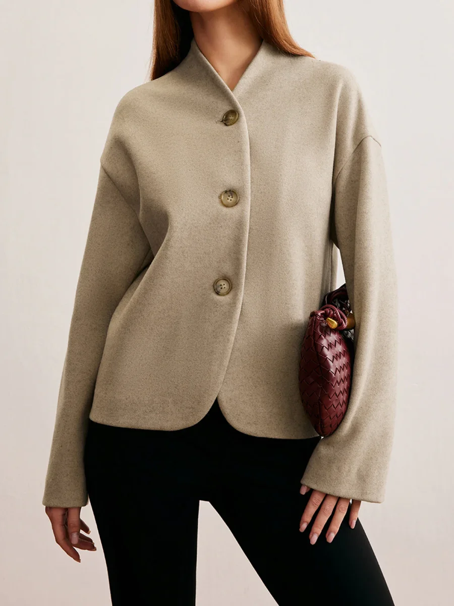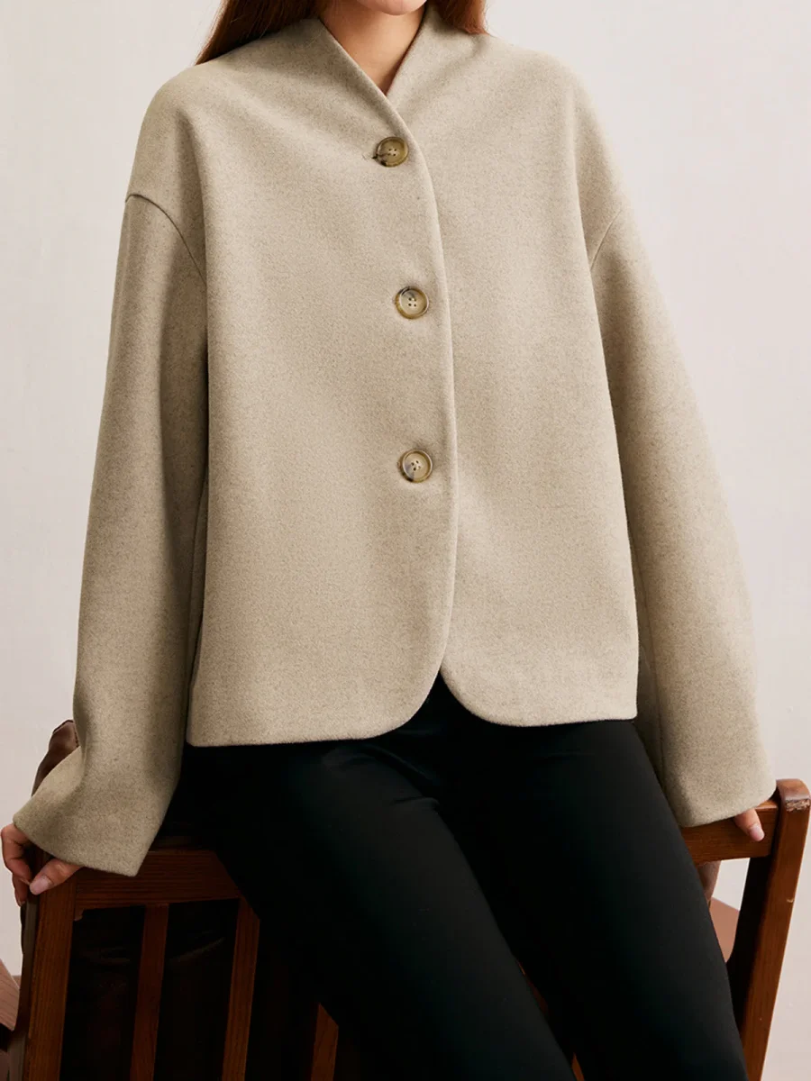 Cette veste courte à la coupe droite incarne la simplicité sophistiquée avec ses lignes épurées et sa matière douce.