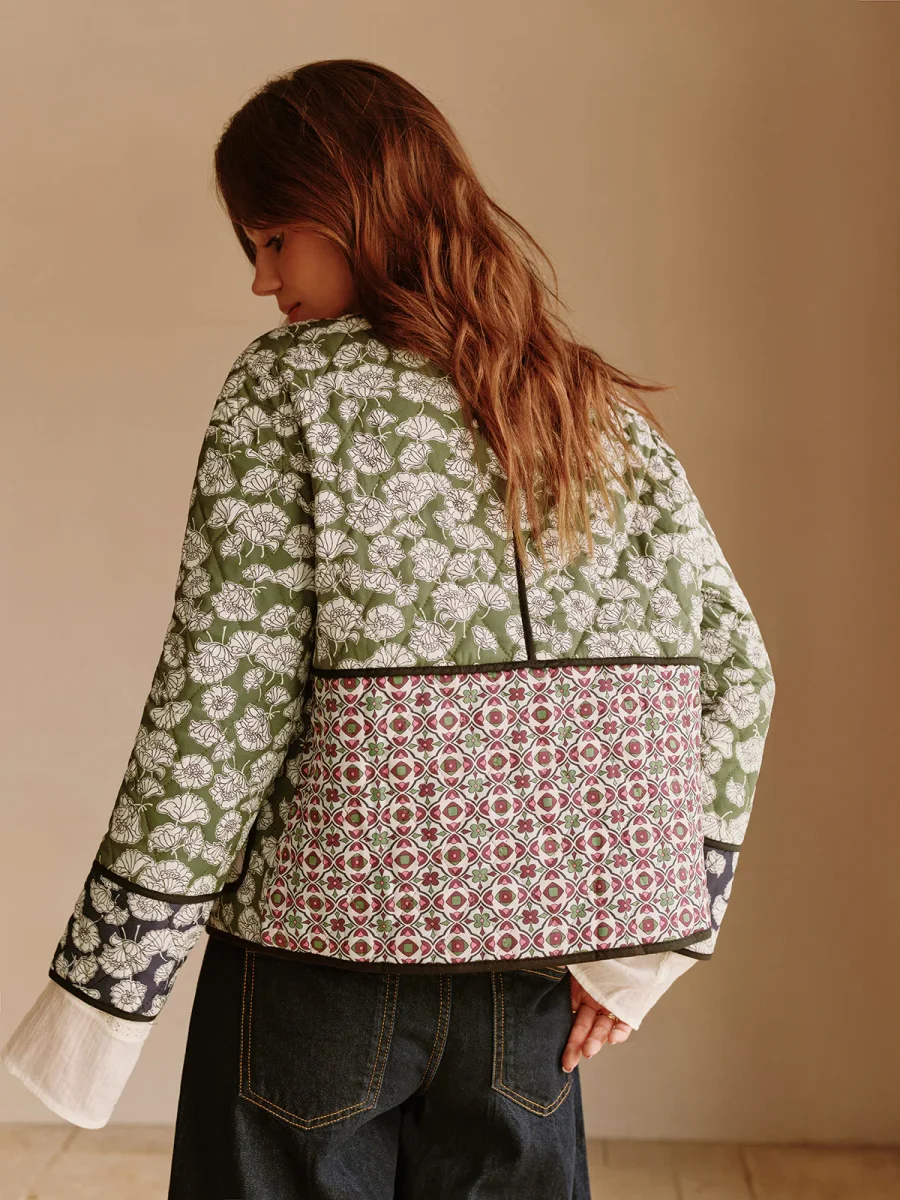 This floral-print quilted jacket combines handcrafted charm with modern comfort.