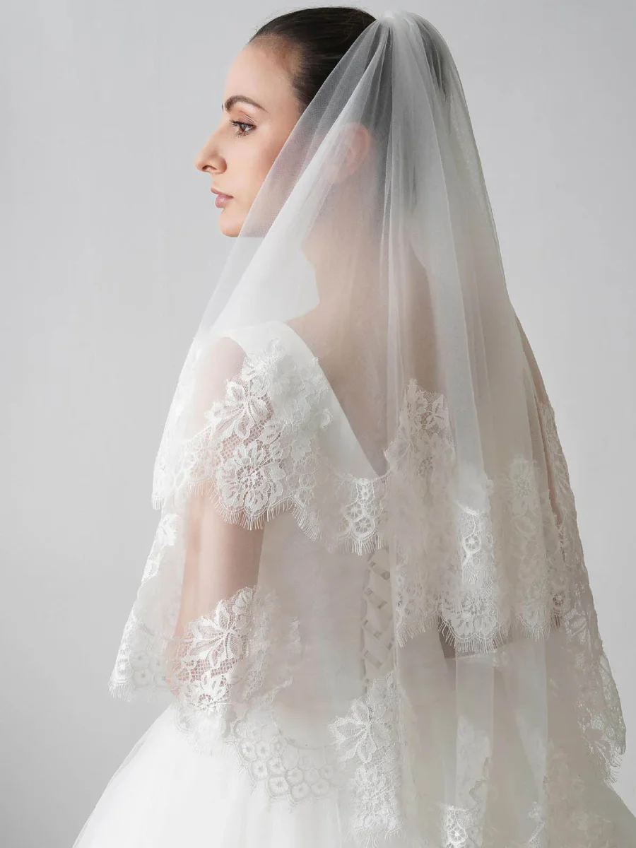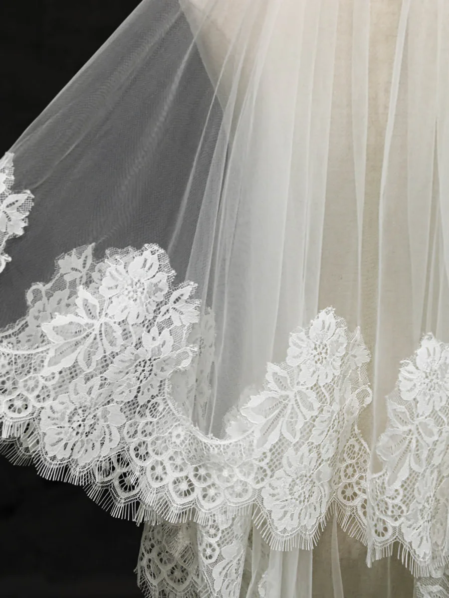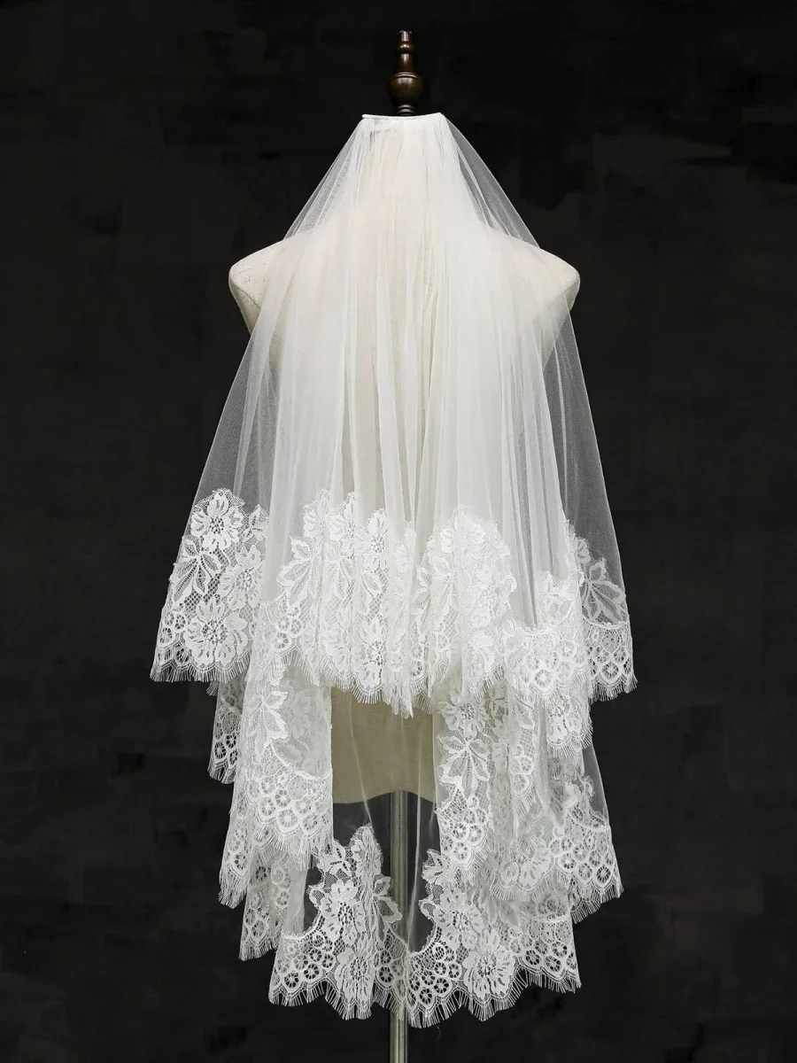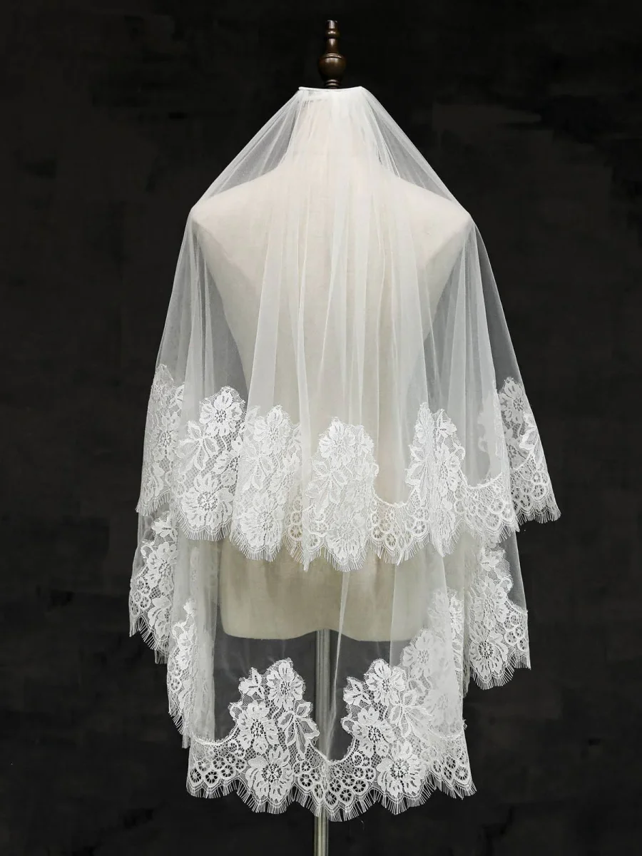 Voile De Mariée Court Rêveur En Dentelle À Deux Couches