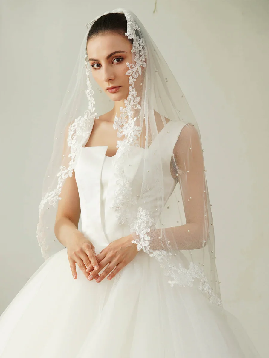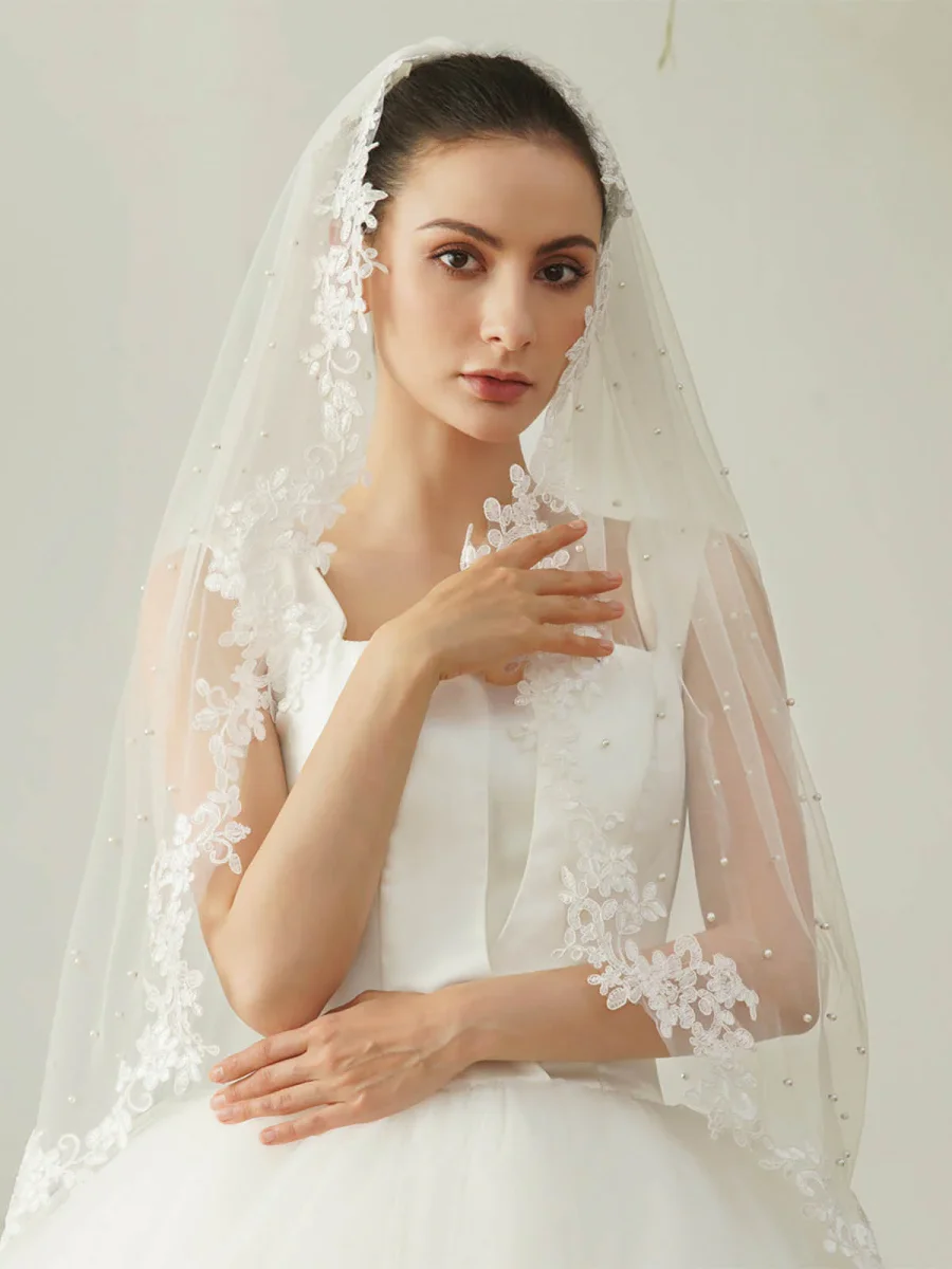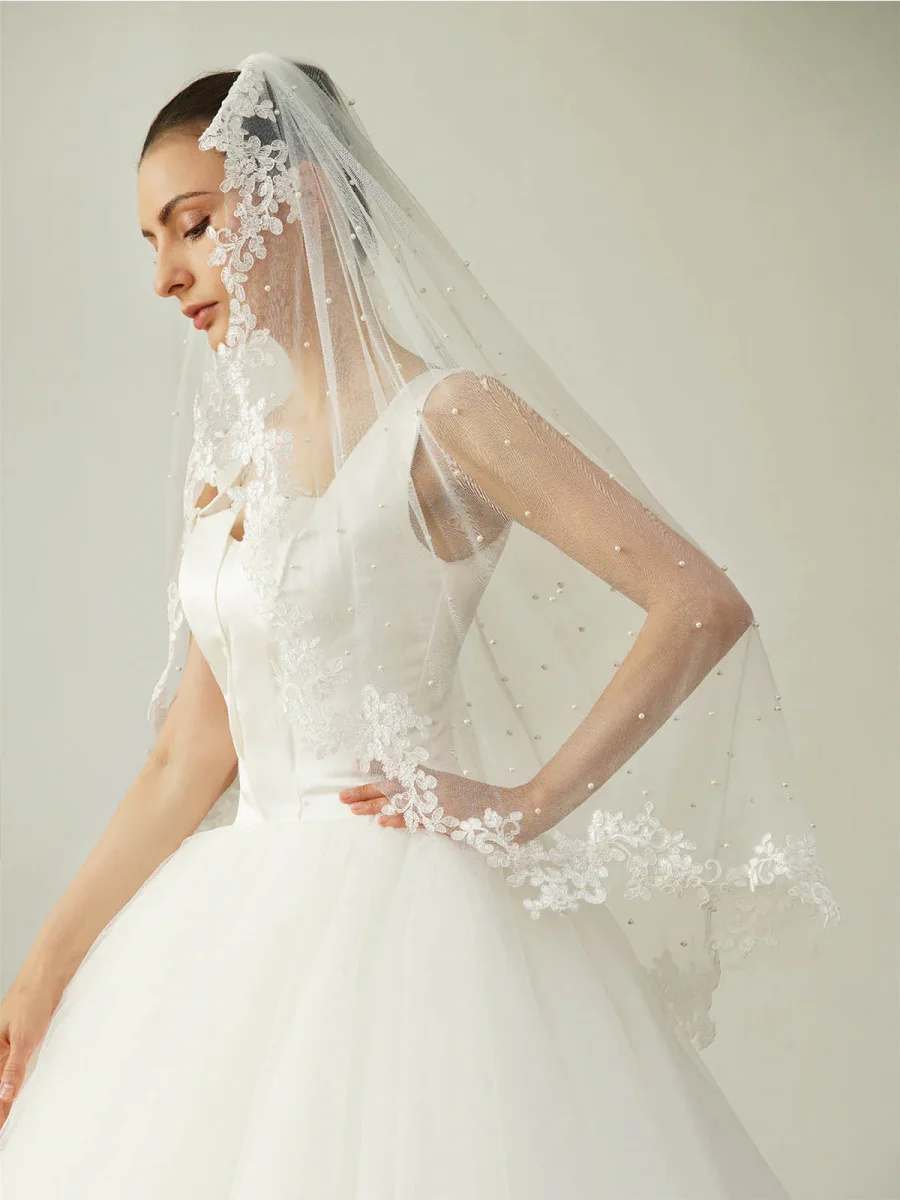 Voile De Mariée En Tulle Bordé De Dentelle Élégant Avec Perles