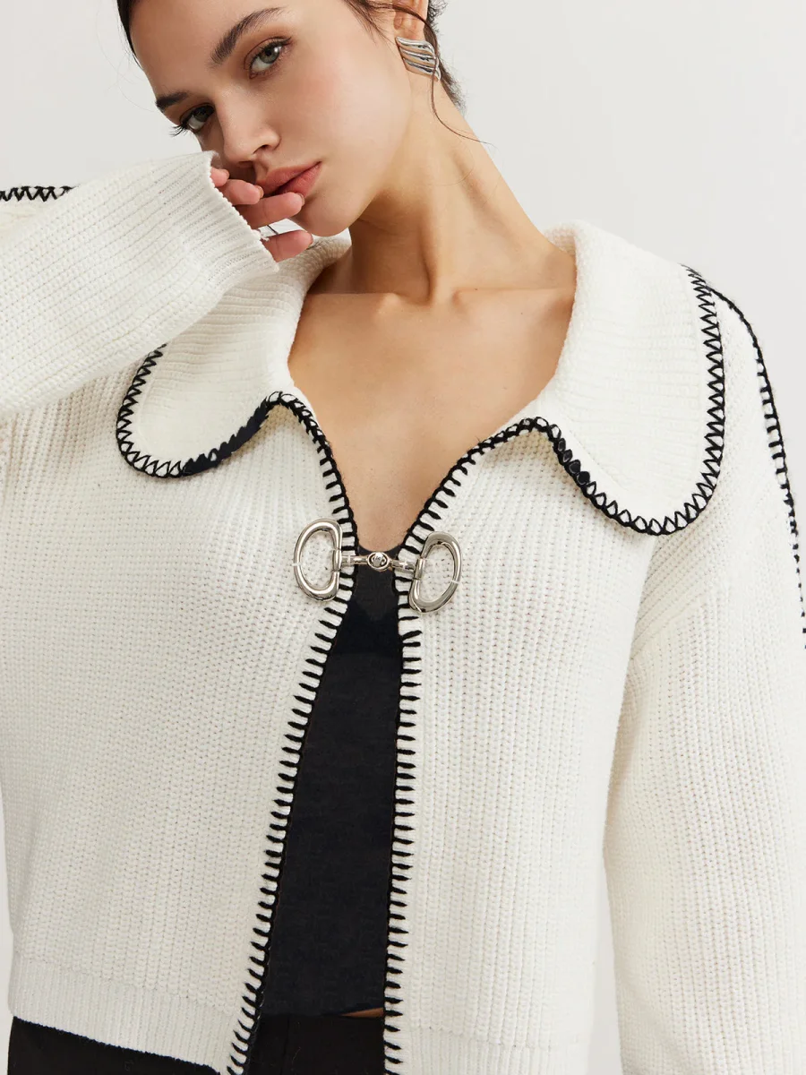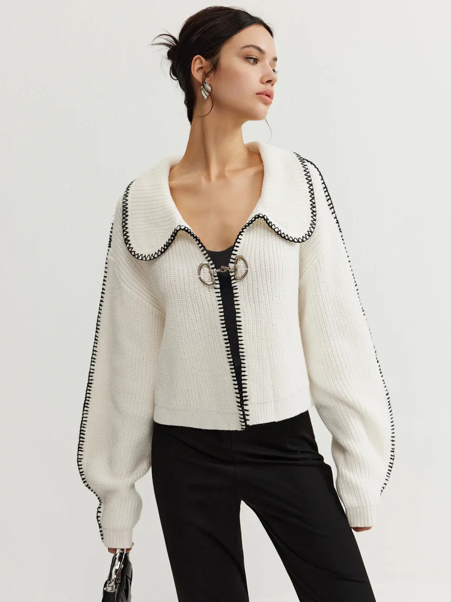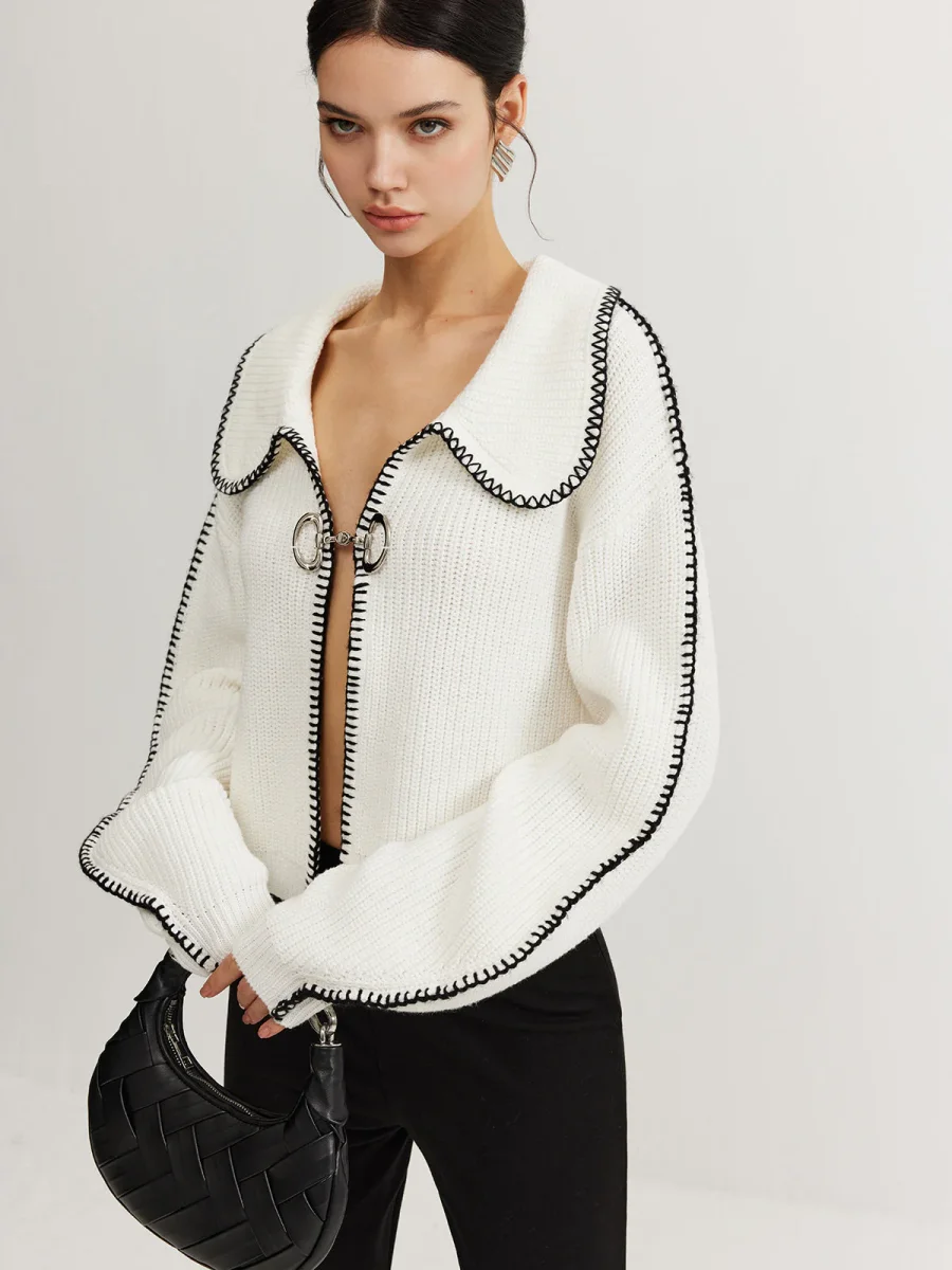 White Contrast Cardigan | Oversize Collar | Chic & Original